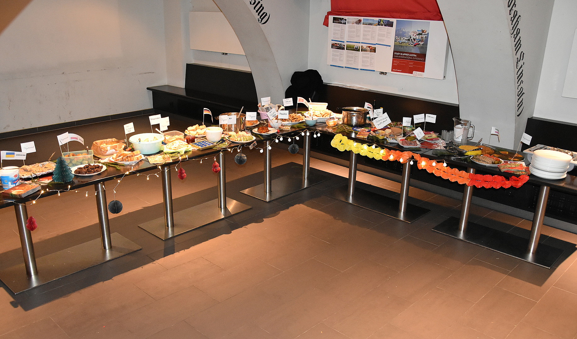 Neben Leckereien aus Marokko, Vietnam und vielen weiteren Nationen gab es auch eine österreichische Brotzeit-Platte sowie gefüllte Weinblätter aus Syrien. Auch für Vegetarier, Veganer und Menschen die sich Halal ernähren, gab es reichlich Auswahl beim Buffet.