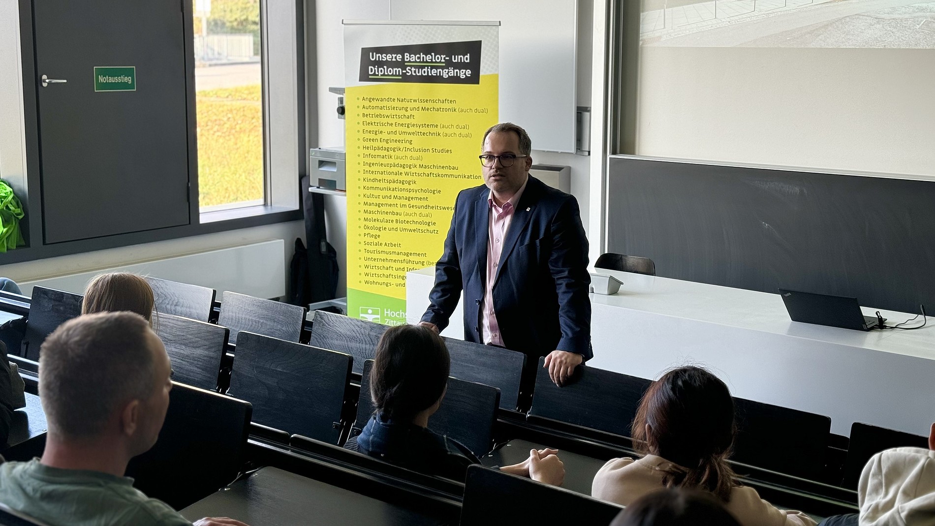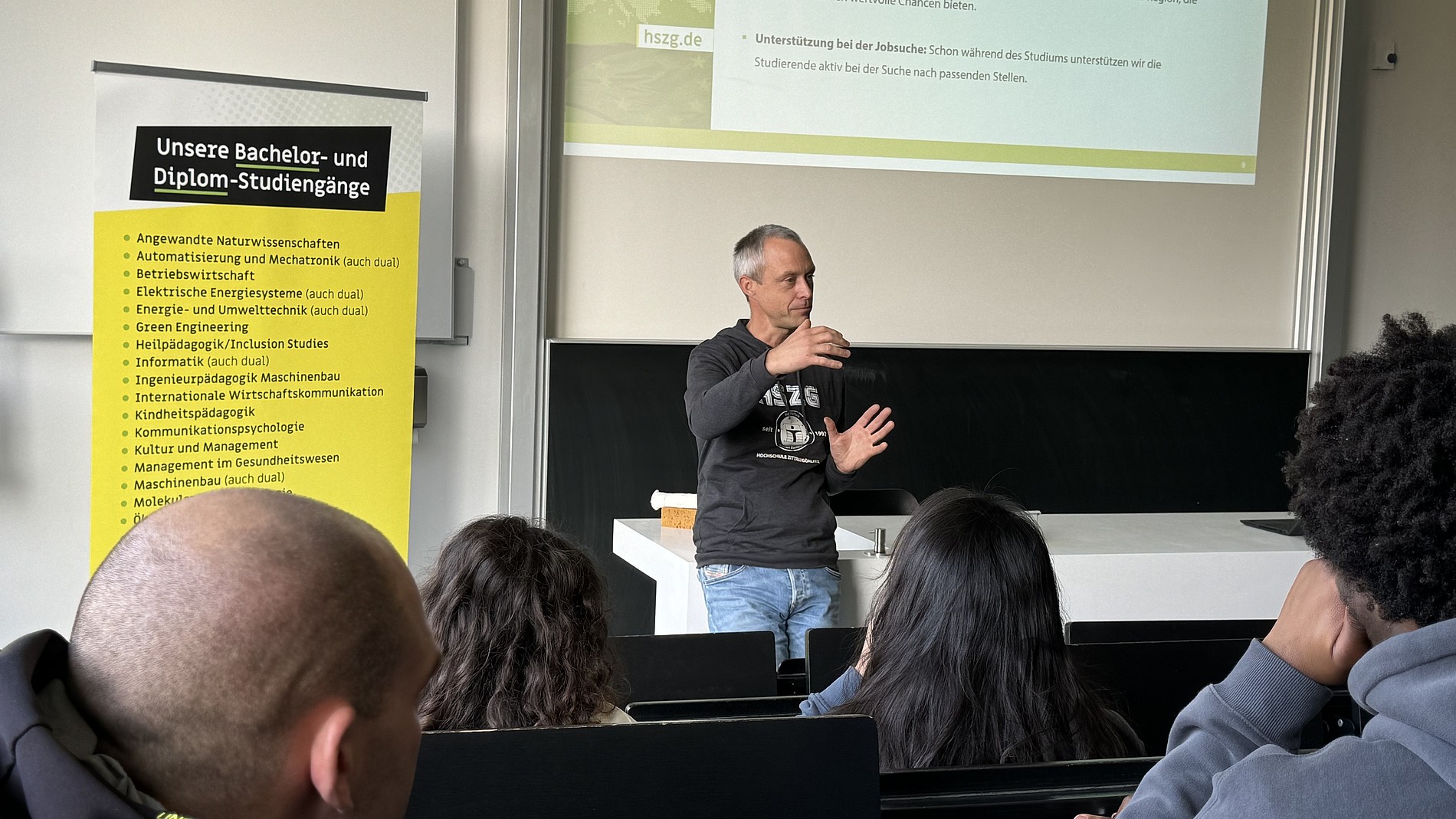 Prof. Dr.-Ing. Alexander Kratzsch, Rektor der HSZG, hieß die Studieninteressierten herzlich willkommen an der Hochschule. Darüber hinaus erhielten die Gäste von Robert Viertel und Inna Hauf, beide vom Prorektorat für Bildung und Internationales, umfassende Informationen rund um das Studium an der HSZG. Inna Hauf teilte dabei ihre eigene Geschichte: Auch sie kam vor mehreren Jahren ohne Deutschkenntnisse nach Deutschland, voller Fragen und Unsicherheiten. Doch durch das Studienkolleg – denselben Weg, den die anwesenden Gäste nun gehen – fand sie ihren Einstieg und schloss anschließend erfolgreich ein Studium ab. Ihr Weg bot den Kollegiatinnen und Kollegiaten einen authentischen Einblick in die Chancen und Möglichkeiten, die ein Studium in Deutschland und insbesondere an der HSZG eröffnet.