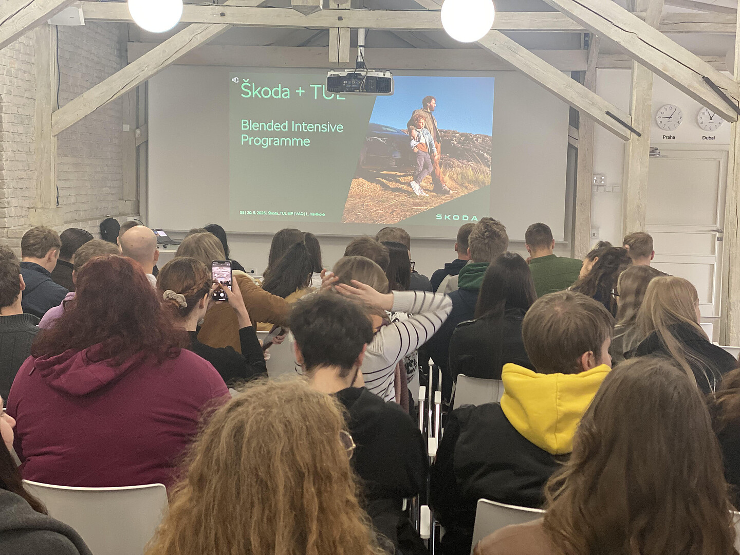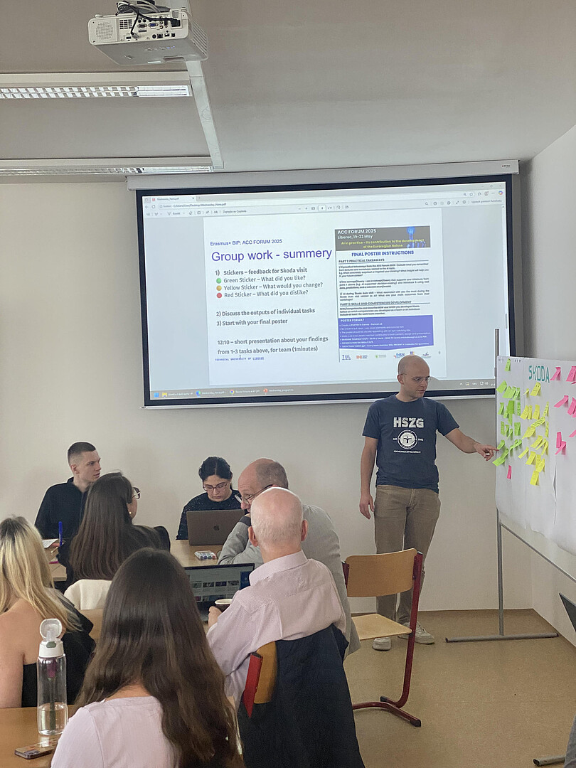 In den internationalen Gruppen arbeiteten sie an einem Plakat, auf dem sie alles an Erfahrungen festgehalten haben, die sie durch die informativen Workshops gesammelt haben. Davon wie die KI die Arbeitswelt verändert wird über Anwendung im Personalwesen bis hin zu Transformationsanwendungen war alles dabei. Ein weiteres Highlight war der Besuch des ŠKODA-Werks in Mladá Boleslav, wo die Studierenden sich das Museum mit der bewegten Geschichte des Unternehmens angeschaut haben, aber auch einen wertvollen Einblick in die Anwendungen KI im Unternehmen. Rundum eine intensive Woche mit tollen Teilnehmenden aus drei Ländern.