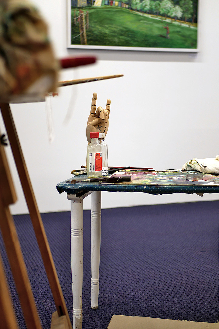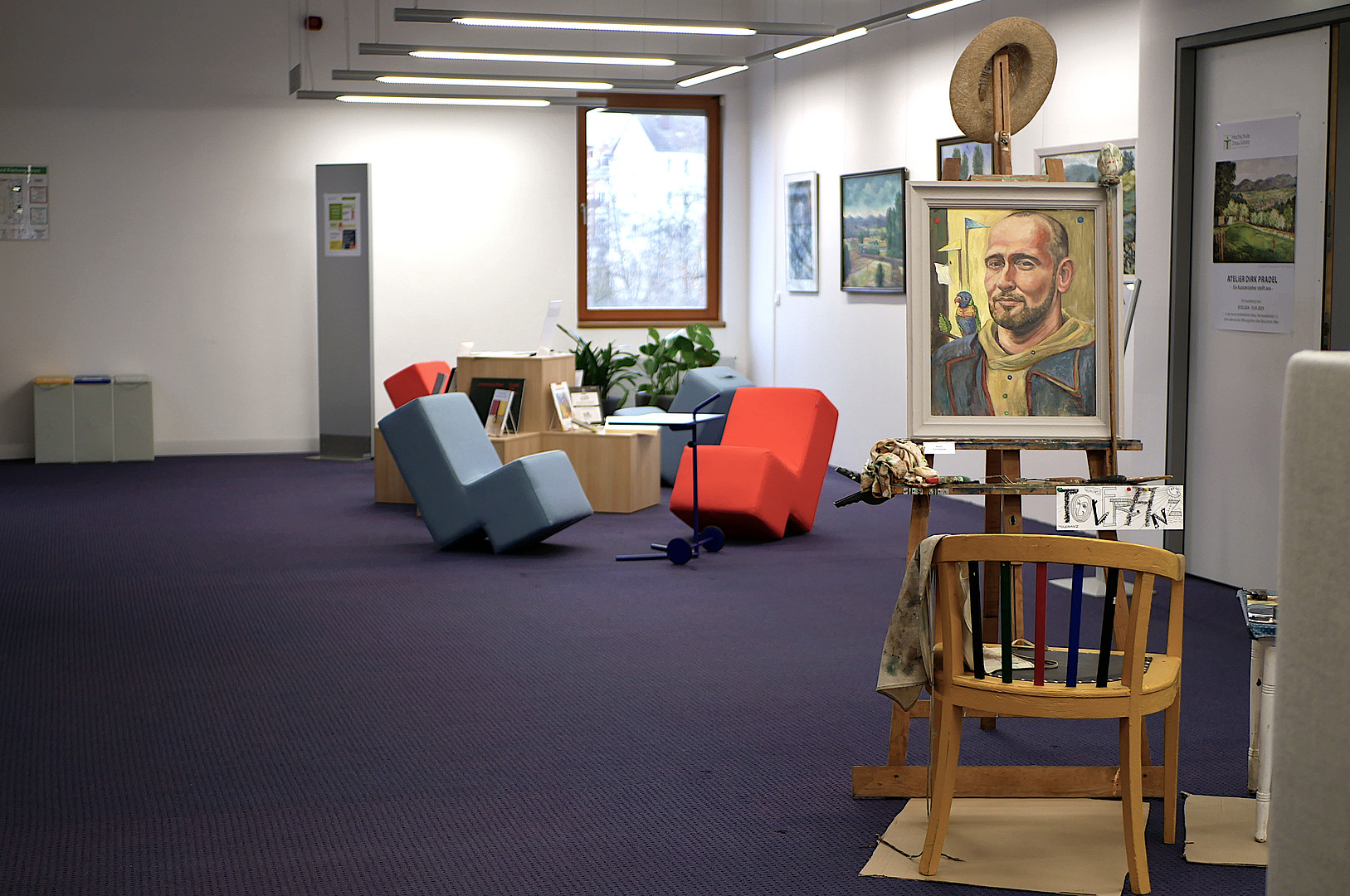 Ein weiterer Nutzer des Ateliers arbeitet an einer Kohlezeichnung, während Dirk Pradel im Nebenraum ein neues Gemälde untermalt. Das Lehren von Gestaltungstechniken ist ihm seit mehr als 25 Jahren als freischaffender Künstler und Kunsterzieher eine Herzensangelegenheit.
