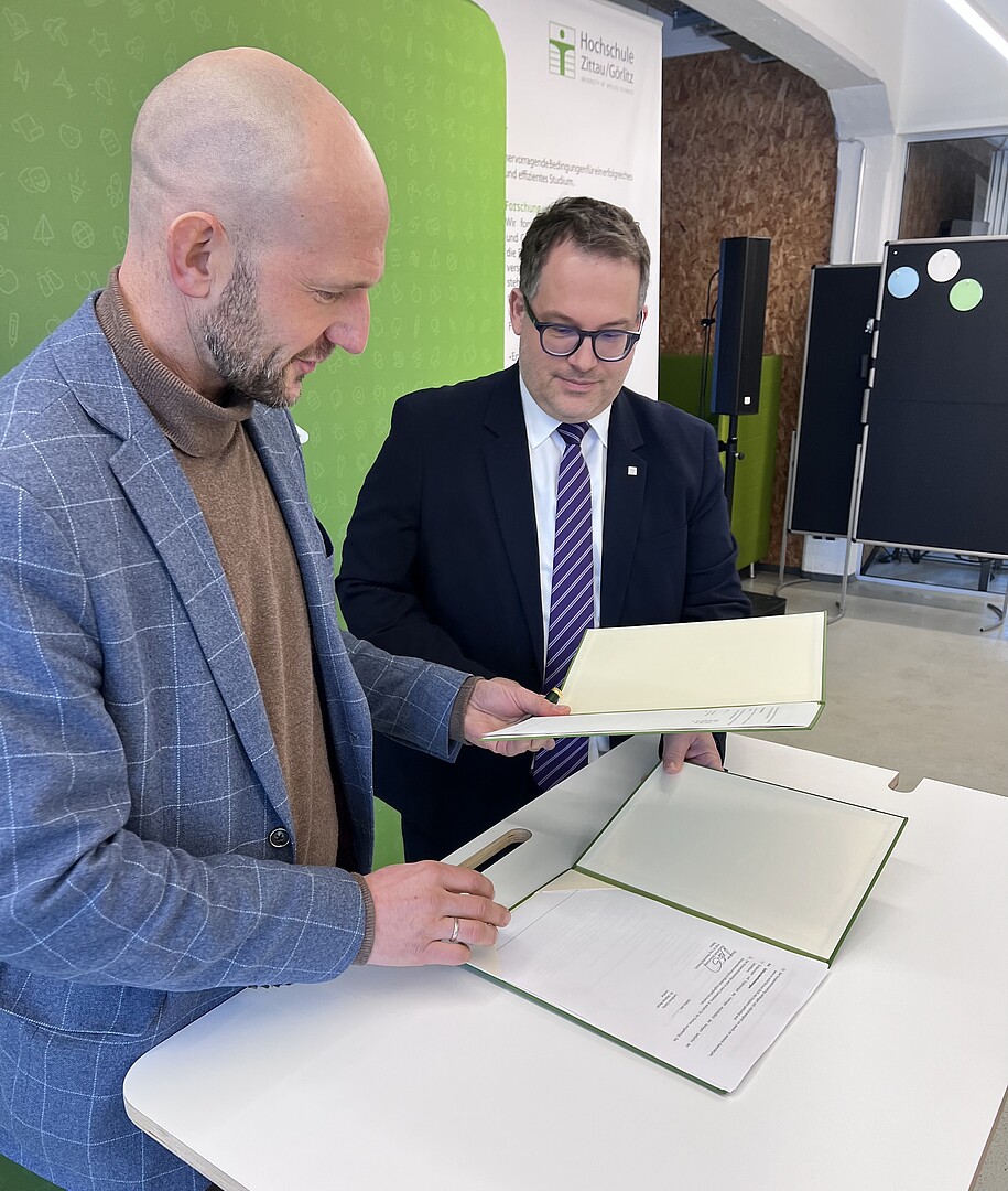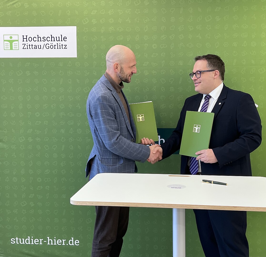 Die Hochschule Zittau/Görlitz (HSZG) freut sich über die Fortsetzung und Vertiefung der Zusammenarbeit mit dem Landkreis Görlitz. Am 12. Januar 2026 unterschrieben Prof. Dr.-Ing. Alexander Kratzsch, Rektor der Hochschule Zittau/Görlitz, und Dr. Stephan Meyer, Landrat des Landkreises Görlitz, an der HSZG in Zittau einen neuerlichen Kooperationsvertrag, dessen Ziel die Stärkung der bilateralen Kooperation in Wirtschaft, Wissenschaft, Bildung und Kultur ist.