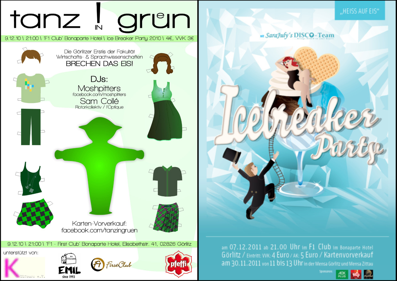 War das wirklich die erste Icebreaker-Party? Nein. Meine Recherche führt mich zurück ins Jahr 2010. Aus diesem Jahr ist eine Facebook Veranstaltung überliefert. Das Motto: Tanz in Grün und als „Icebreaker-Party 2010“ untertitelt, die am 09.12.10 im First stattgefunden hat – die Fotos dort sprechen für sich. Was heute eine große datenschutzrechtliche Problematik darstellen würde, sieht damals nach einer Menge Spaß und einer gelungenen Party aus. Auch im darauffolgenden Jahr fand am 7.12.11 im First die Icebreaker-Party „Heiß auf Eis“ statt. Dann wird es lange Zeit still und auch meine Recherchen ergeben nichts Weiteres.