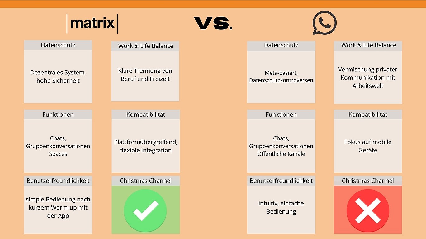 Kommunikation ist in der Hochschulwelt unverzichtbar – sei es für den Austausch zwischen Studierenden und Lehrenden oder für die Organisation von Projekten. Wir vergleichen den Matrix Messenger und WhatsApp in fünf Kategorien: Datenschutz, Funktionen, Work-Life-Balance, Kompatibilität und Benutzerfreundlichkeit. Welche Plattform bietet die besten Lösungen für den Hochschulalltag?