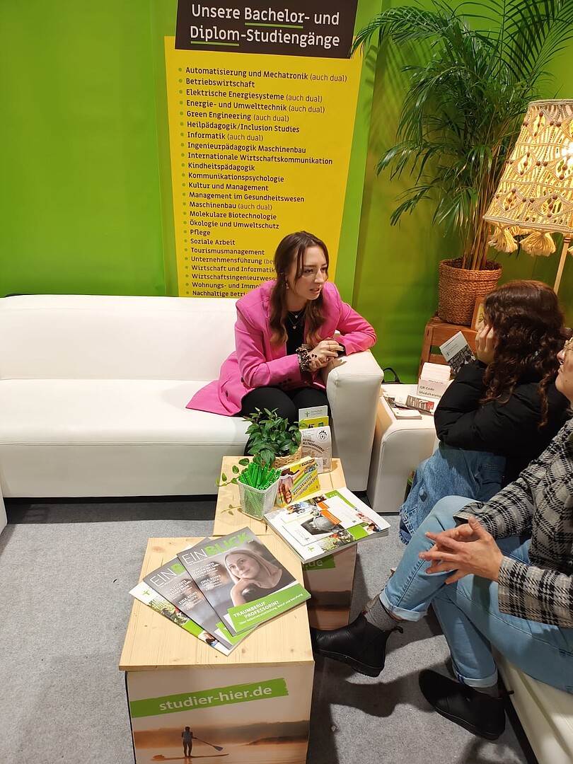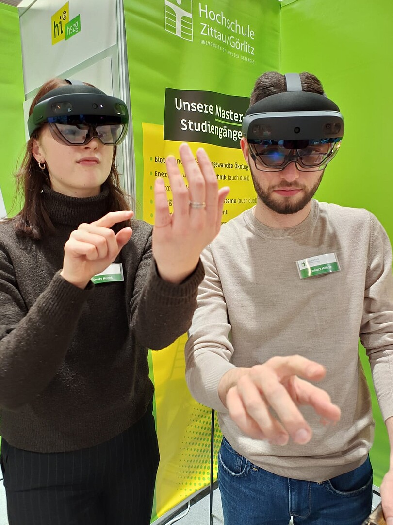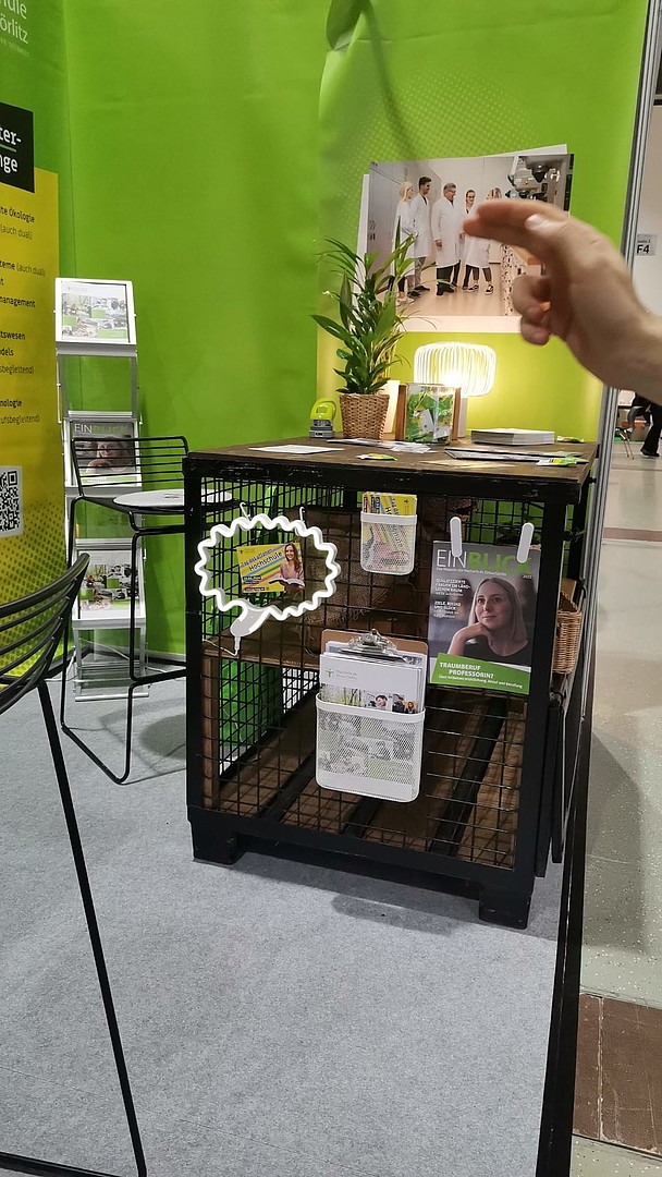 Unsere Hochschule war mit zwei Messeständen vertreten. Der erste Stand präsentierte geisteswissenschaftliche Fachrichtungen in einem gemütlichen Besprechungsraum, der dazu einlud, in entspannter Atmosphäre detaillierte Gespräche zu führen. Der zweite Stand hingegen setzte auf Interaktivität durch eine Augmented-Reality-Brille – ein Projekt von Daniel Winkler, Referent Hochschuldidaktik, das von jedem Besucher ausprobiert werden konnte.