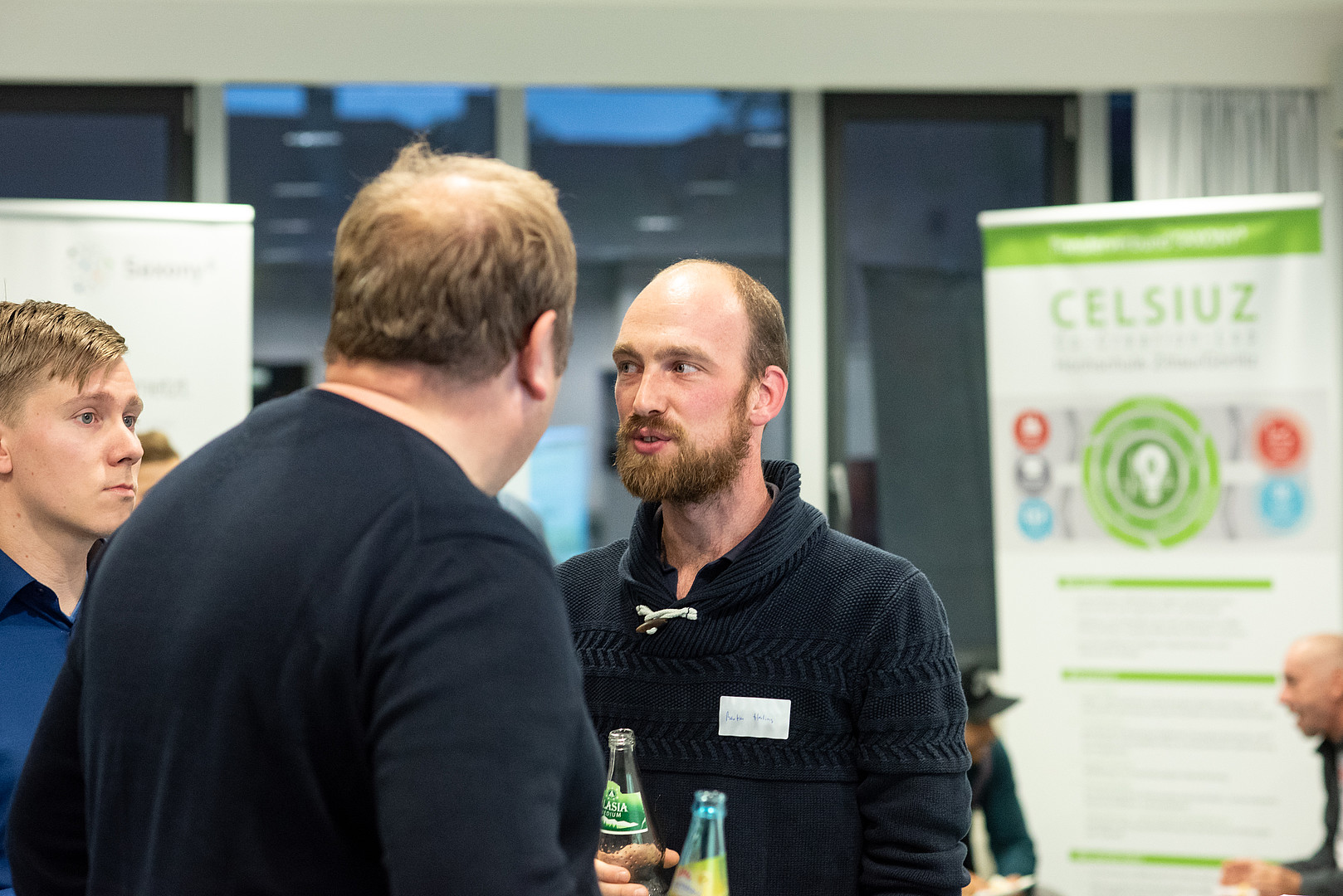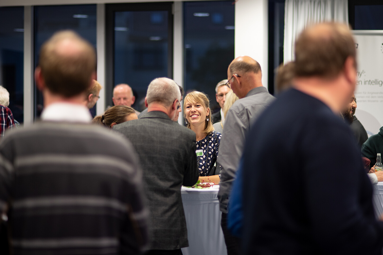 Im Anschluss wurden angeregt bei einem kleinen Imbiss die Möglichkeiten der KI weiter gedacht und an ausgestellten praktischen Beispielen diskutiert. Das Institut für Prozessautomatisierung, Prozesstechnik und Messtechnik (IPM) zeigte seine Arbeiten am Beispiel eines Bildverarbeitungssystems zur Überprüfung von Rietbleien in der Textilindustrie sowie der Nutzung eines künstlichen neuronalen Netzes zur Erkennung von Objekten.