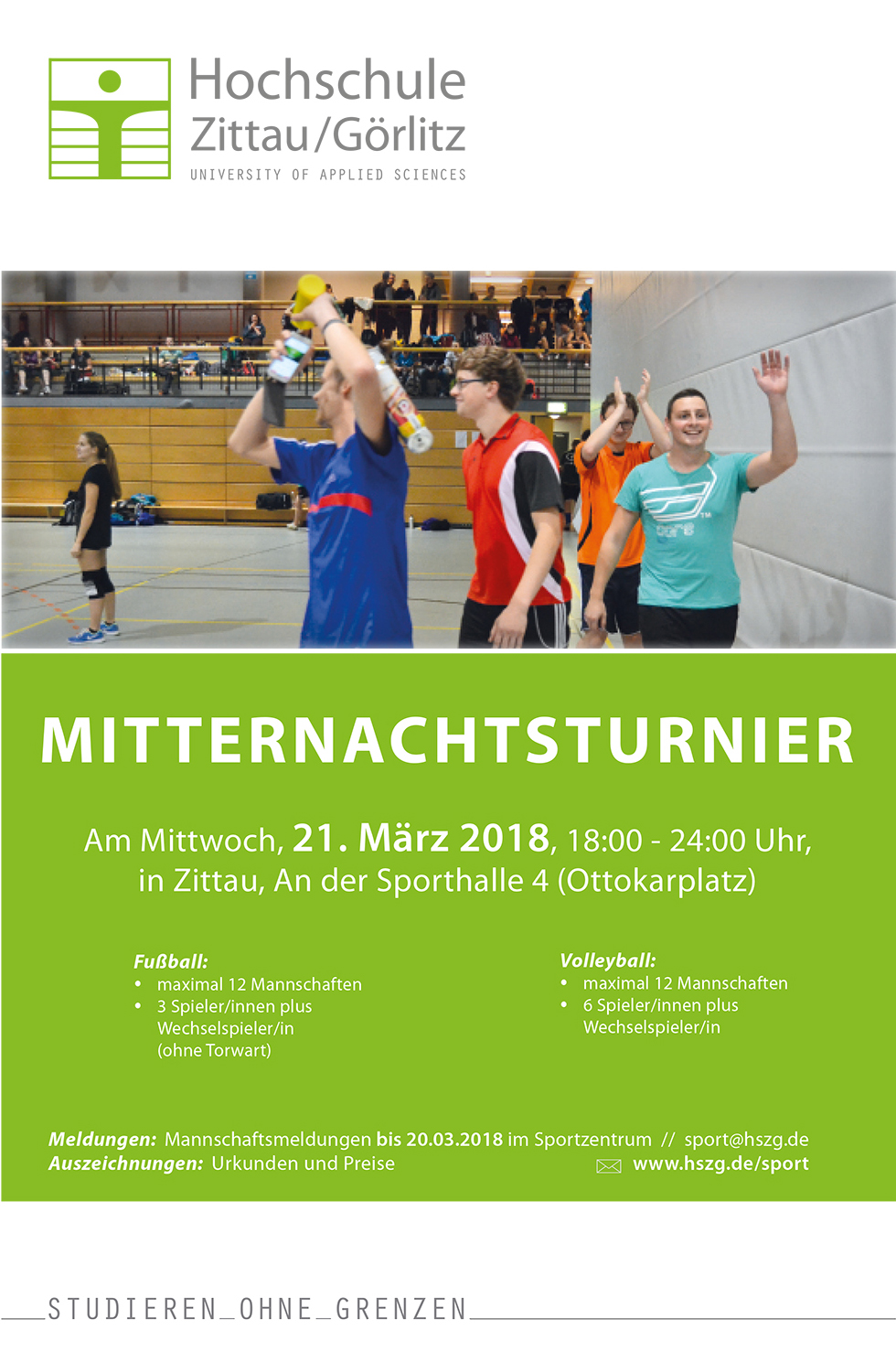 das Team des Hochschulsportzentrums lädt euch alle herzlich zum traditionellen Mitternachtsturnier am Mittwoch, den 21.03.2018 in die Sporthalle Ottokarplatz in Zittau ein. Alle wichtigen Informationen zum Turnier findet ihr unter folgendem Link: