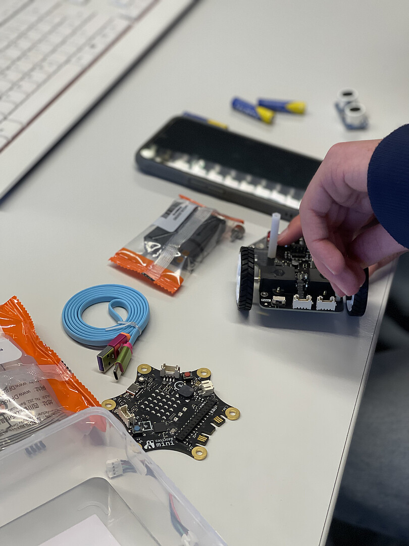 Nachdem die Grundlagen erlernt waren, folgte im vergangenen Dezember der nächste Schritt: die Erweiterung des Calliope mini mit dem Motion Kit. Zunächst stand der mechanische Zusammenbau auf dem Programm, bei dem die Schülerinnen und Schüler ihre Roboter selbstständig montierten und dabei ein besseres Verständnis für die Hardware entwickelten. Anschließend wurde ein Parcours entworfen, dessen Verlauf durch einen selbst programmierten Zufallsgenerator bestimmt wurde.