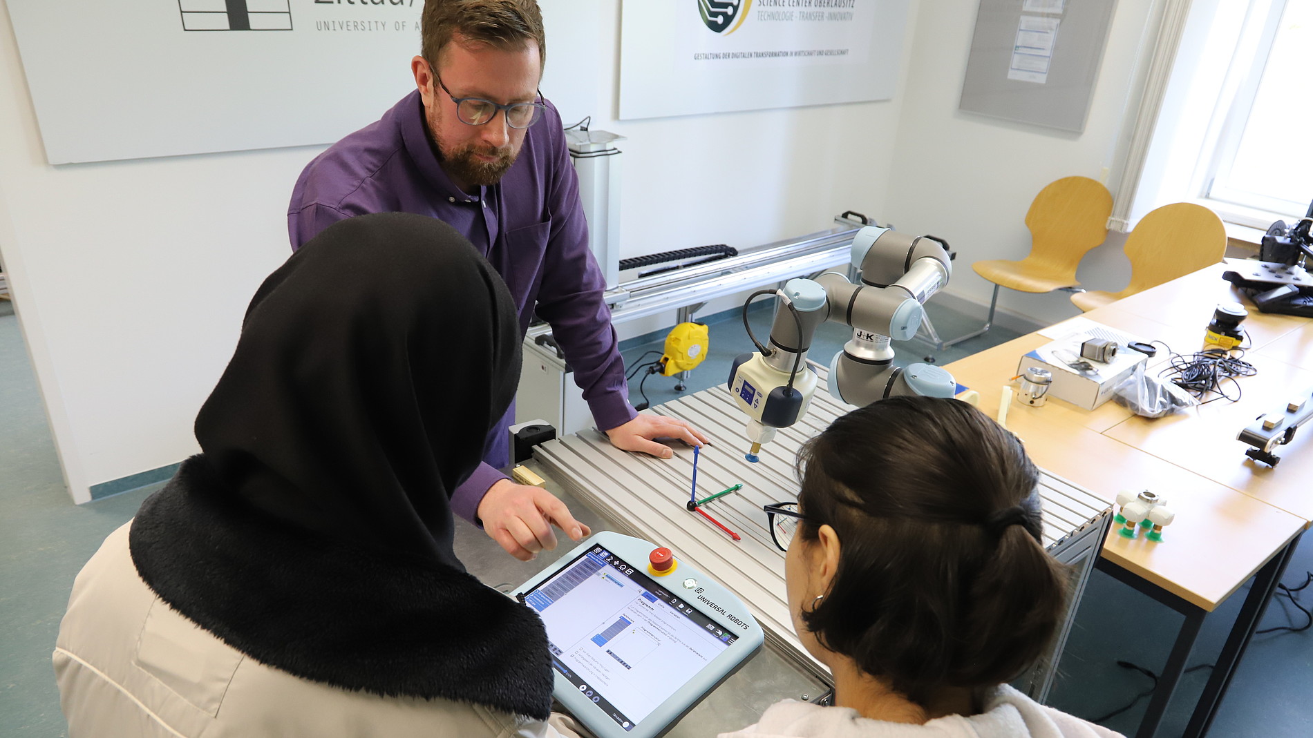 Wow-Effekte gab es auch im SCO-TTi-Labor der Fakultät Wirtschaftswissenschaften und Wirtschaftsingenieurwesen. Hier demonstrierten die Mitarbeiter des Instituts für Prozesstechnik, Prozessautomatisierung und Messtechnik (IPM) Daniel Fiß und Christian Vogel einer Gruppe von Siebt- und Neuntklässlerinnen der Richard-von-Schlieben-Oberschule Zittau und des Geschwister-Scholl-Gymnasiums Löbau, wie man einen Roboter dazu bringt, mit einem Menschen zusammenzuarbeiten.