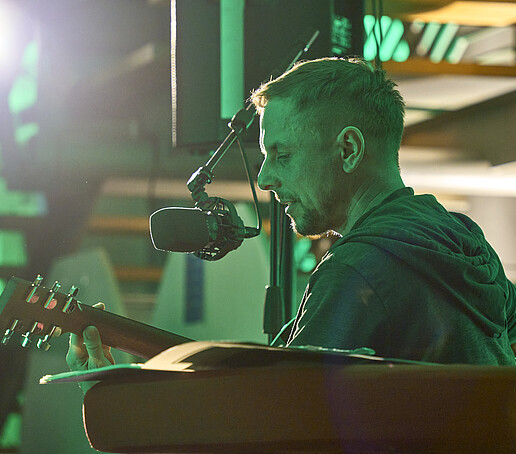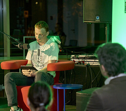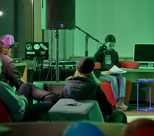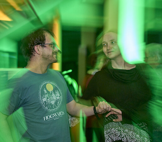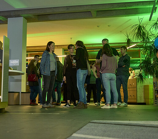 In Zittau endete der Abend mit einer Party zum Tanzen, Quatschen und Beisammensein. Die Hochschulbibliothek wurde dazu in grünes Licht getaucht.