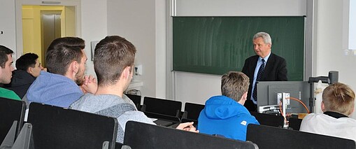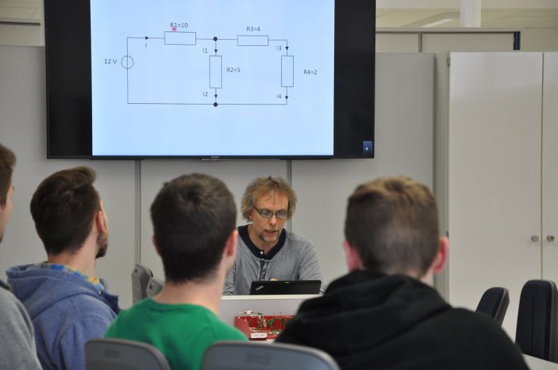 In einer kleinen Vorlesung erklärte Prof. Haim, Dekan der Fakultät Elektrotechnik und Informatik die wesentlichen Arbeitstechniken zur Berechnung, Vereinfachung und Umformung von Schaltungen mit Widerständen.