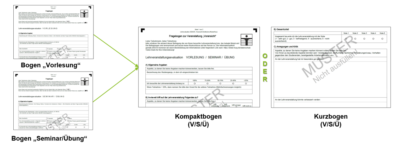 • Für die Evaluation der verschiedenen Lehrformen wie Vorlesungen, Seminare und Übungen, die bis dato separat erfolgte, gibt es jetzt einen kombinierten Fragebogen. Dieser ist in zwei Varianten verfügbar – als Kompaktbogen mit einer Reihe von Ankreuzfragen und ausreichend Platz für textbasierte Hinweise sowie als Ultrakurzbogen mit Fokus auf textbasiertes Feedback. So ist ein sehr spezifisches und individuelles Feedback unserer Studierenden möglich. Für das Lehrformat der Laborpraktika kann weiterhin ein separater Fragebogen genutzt werden.