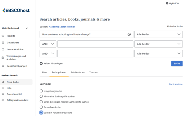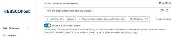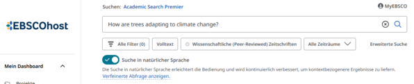 In der erweiterten Suche wird unter Suchoptionen → Suchmodi → Suche in natürlicher Sprache ausgewählt oder in der einfachen Suche der Schieberegler auf “Suche in natürlicher Sprache” gestellt.