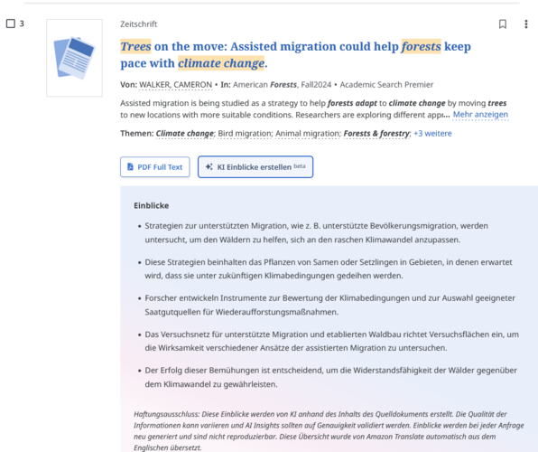 Das Feature AI Insights erstellt Zusammenfassungen aus Volltextartikeln über den Button “KI Einblicke erstellen” / “Generate AI Insights”. Es handelt sich aber noch um eine Beta-Version und kommt nur bei den lizenzierten Datenbanken, jedoch nicht bei den E-Books zum Einsatz.