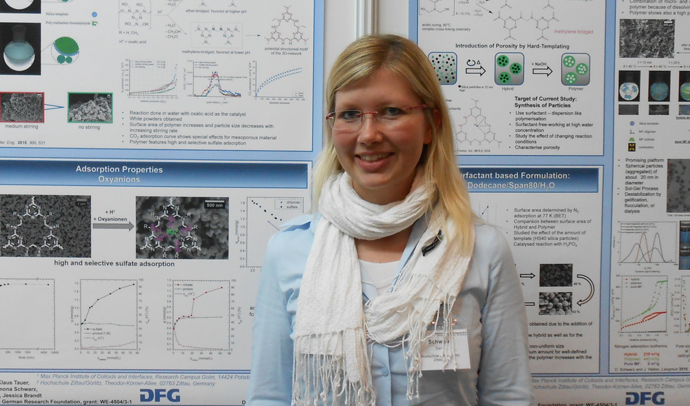 Forschungsmitarbeiterin M.Sc. Dana Schwarz (Doktorandin im AK Weber) präsentierte zwei Posterbeiträge aktueller Arbeiten zur Synthese von hochporösen Melamin-Formaldehydharzen sowie ihrer Eignung zur Adsorption von Oxyanionen. Die unüblichen und unerwarteten Adsorptionseigenschaften konnten dabei mit dem interessierten Fachpublikum diskutiert werden. Die Ergebnisse sind Teil eines von der DFG geförderten Projektes und wurden teilweise bereits in Fachzeitschriften publiziert (Macromol. Mater. Eng. 2015, 300, 531-541; Langmuir 2015, im Druck). Ebenfalls publizierte Arbeiten zum Einsatz von Lignin als Rohstoff für effiziente CO2-Adsorbermaterialien (ChemSusChem 2014, 7, 3312–3318) auf Polymerbasis wurden von Prof. Weber im Rahmen eines Vortrages präsentiert. Die Kurzzusammenfassungen der Beiträge wurden im „Book of Abstracts“ der Tagung publiziert (ISBN: 978-3-936028-89-8).