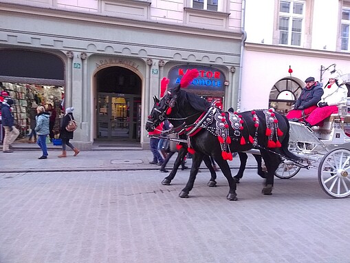 Erste interkulturelle Vergleiche zu unserem Nachbarland ziehen wir auf dem Weihnachtsmarkt, der sehr präsent auf dem Hauptmarkt Krakaus ist. Anschließend wird der Rest des Stadtkerns, in dem die Straßen schachbrettartig angeordnet sind, erkundet. Zwischen alten Barock- und Gotikgebäuden klappern überall schneeweiße Pferdekutschen. Weihnachtsdekoration ist zu dieser Jahreszeit auch hier allgegenwärtig.