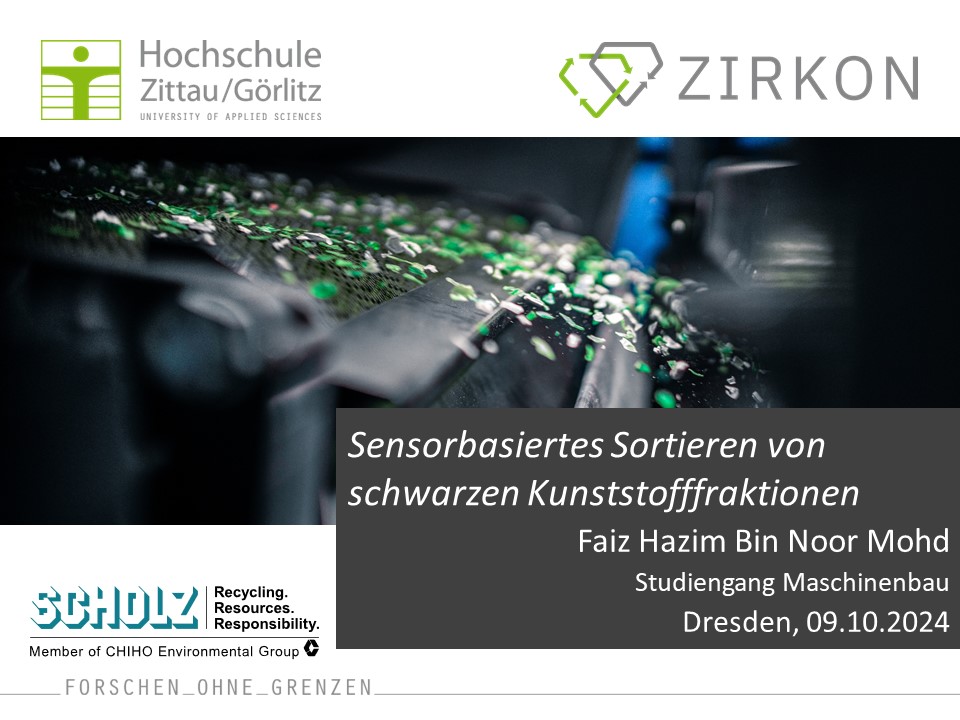 Im Wintersemester 2023/2024 absolvierte Herr Faiz Bin Norh Mood sein Praxissemester bei der Firma SCHOLZ Recycling GmbH. Die Firma Scholz Recycling GmbH ist ein Unternehmen, welches in großem Maßstab Autos, Züge, Technische Geräte und verschiedenste Aggregate einem fachgerechten Recycling zuführt. Neben der Metallgewinnung steht die Kreislaufführung von Kunststoffen immer häufiger im Fokus. SCHWARZ ist die vorherrschende Farbe in technischen Anwendungen - egal ob Auto, Werkzeug, Haushaltsgerät oder Informationstechnik. Da schwarze Körper einen großen Teil der Strahlung absorbieren, ist eine sensorbasierte Sortierung mittels Infrartostrahlung nicht einfach. Die Firma SteinertUNisort hat sich als Anlagenbauer für Sortiertechnik der Herausforderung gestellt und für diese Gruppe der Kunststoffe eine neue Sortieranlage entwickelt. Der Student hatte die Möglichkeit im Rahmen seines 20ig-wöchigen Praxissemesters die Inbetriebnahme dieser Anlage am Standort in Espenhain mit seinen Versuchen zu begleiten.