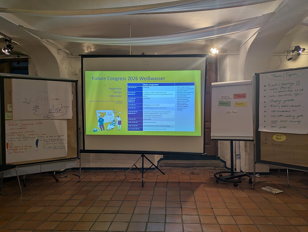 Gleichzeitig rückte der Future Congress in den Mittelpunkt. Eine vorläufige Grundkonzeption sowie verschiedene Formatideen wurden vorgestellt, diskutiert und weiterentwickelt. Die Jugendlichen brachten dabei ihre eigenen Vorstellungen, Wünsche und Ideen für die Veranstaltung ein und gaben wichtige Impulse und Anregungen.