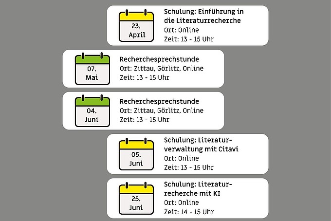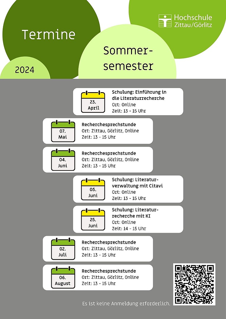 Im Sommersemester 2024 laden wir euch ganz herzlich zu unseren Recherchesprechstunden jeden ersten Dienstag im Monat ein. Die Sprechstunden finden vor Ort in Zittau und Görlitz jeweils von 13 bis 15 Uhr statt. Eine Voranmeldung ist nicht erforderlich, weitere Termine können nach Absprache stattfinden. Außerdem beantworten wir eure Fragen rund um die Literaturrecherche in einem Online-Meetingroom (BigBlueButton).