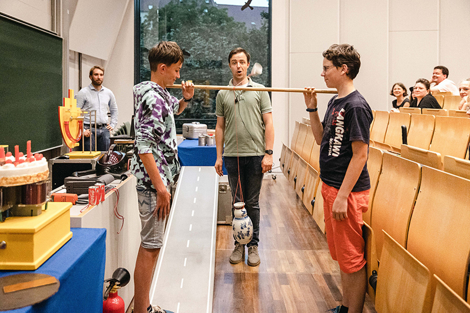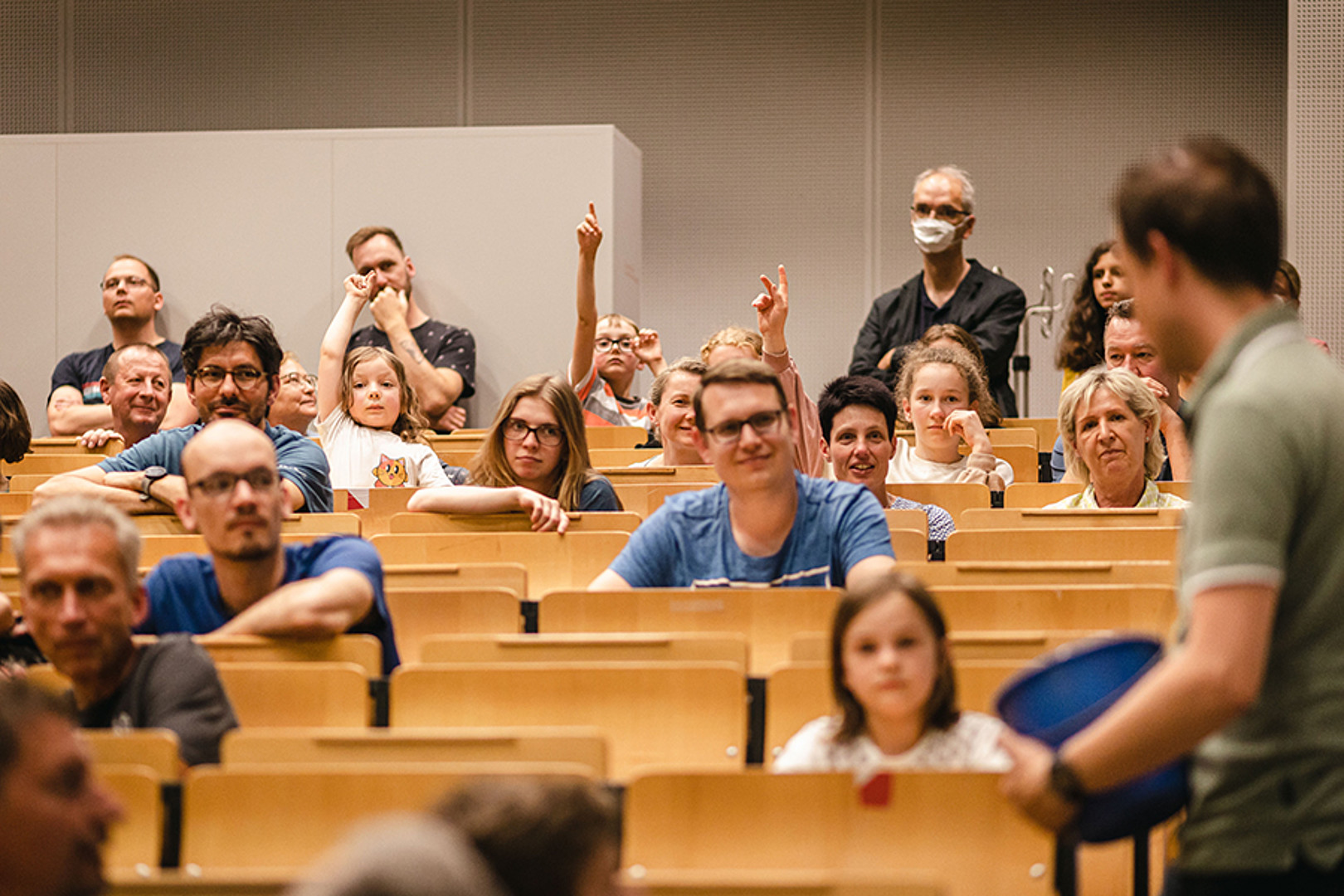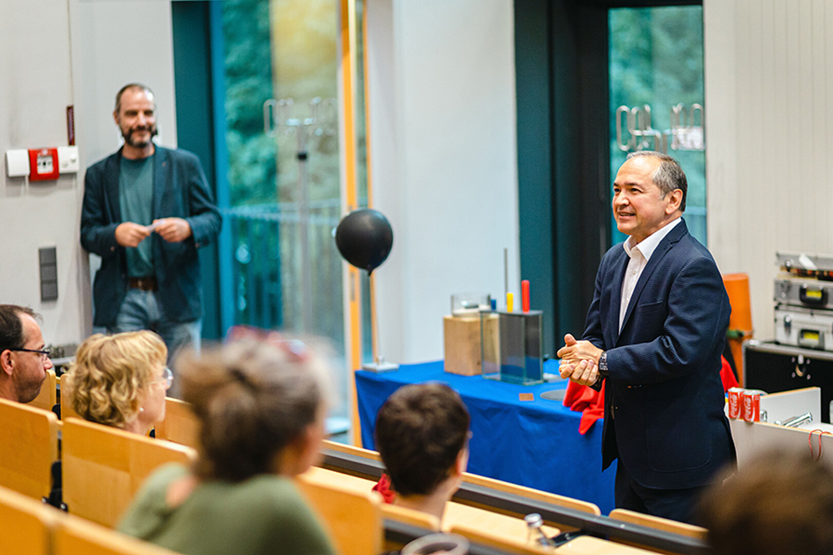 Ab 20 Uhr versammelten sich alle Neugierigen an den beiden Hochschulstandorten. In Görlitz startete die Abendveranstaltung im großen Hörsaal. Es wartete eine Experimente-Show zum Miträtseln und drei Science-Slam Vorträge. Aber zuvor gab es offizielle Grußworte und die Verlosung von Preisen für die erfolgreichen Stempelrallyisten.