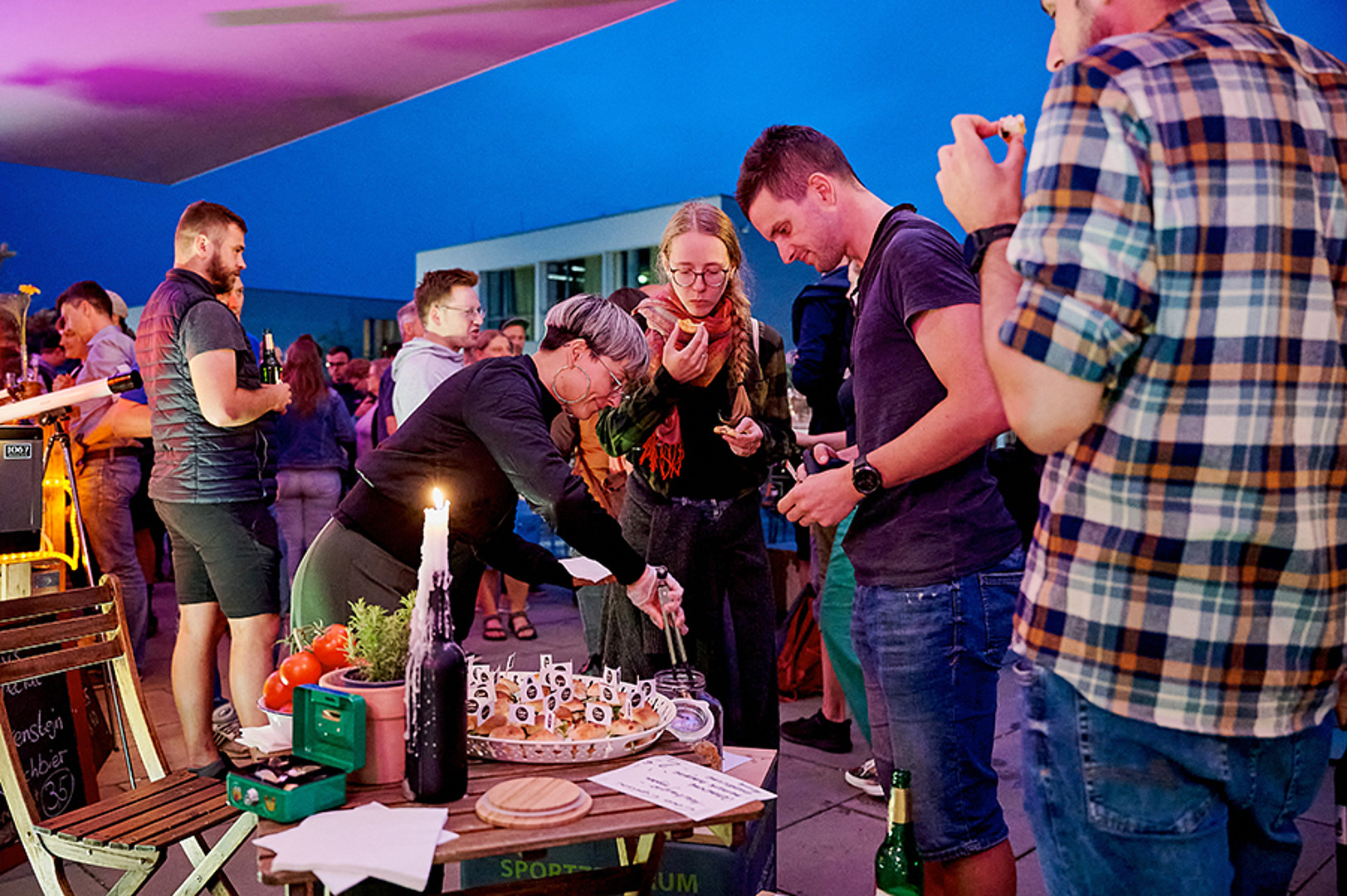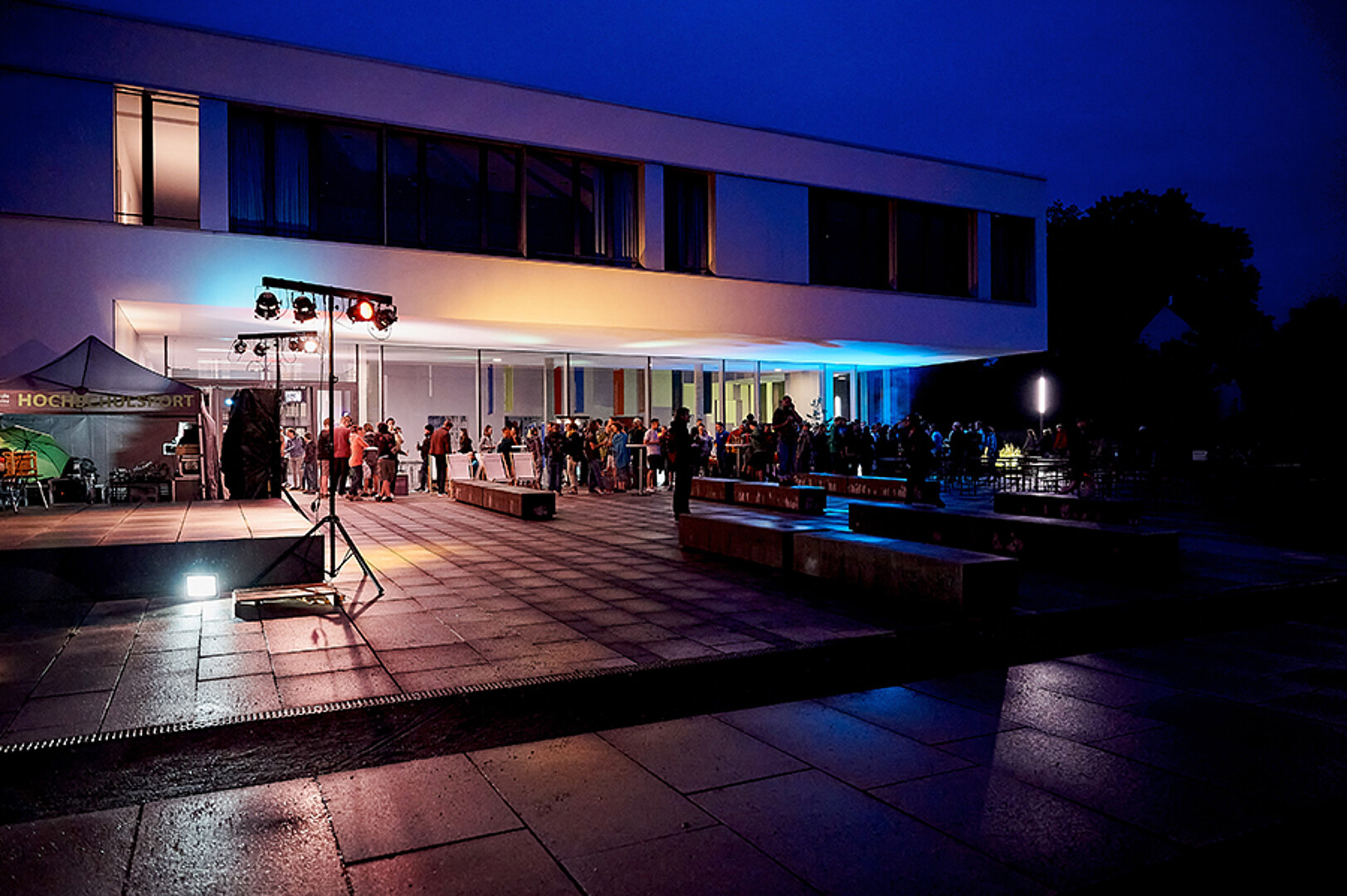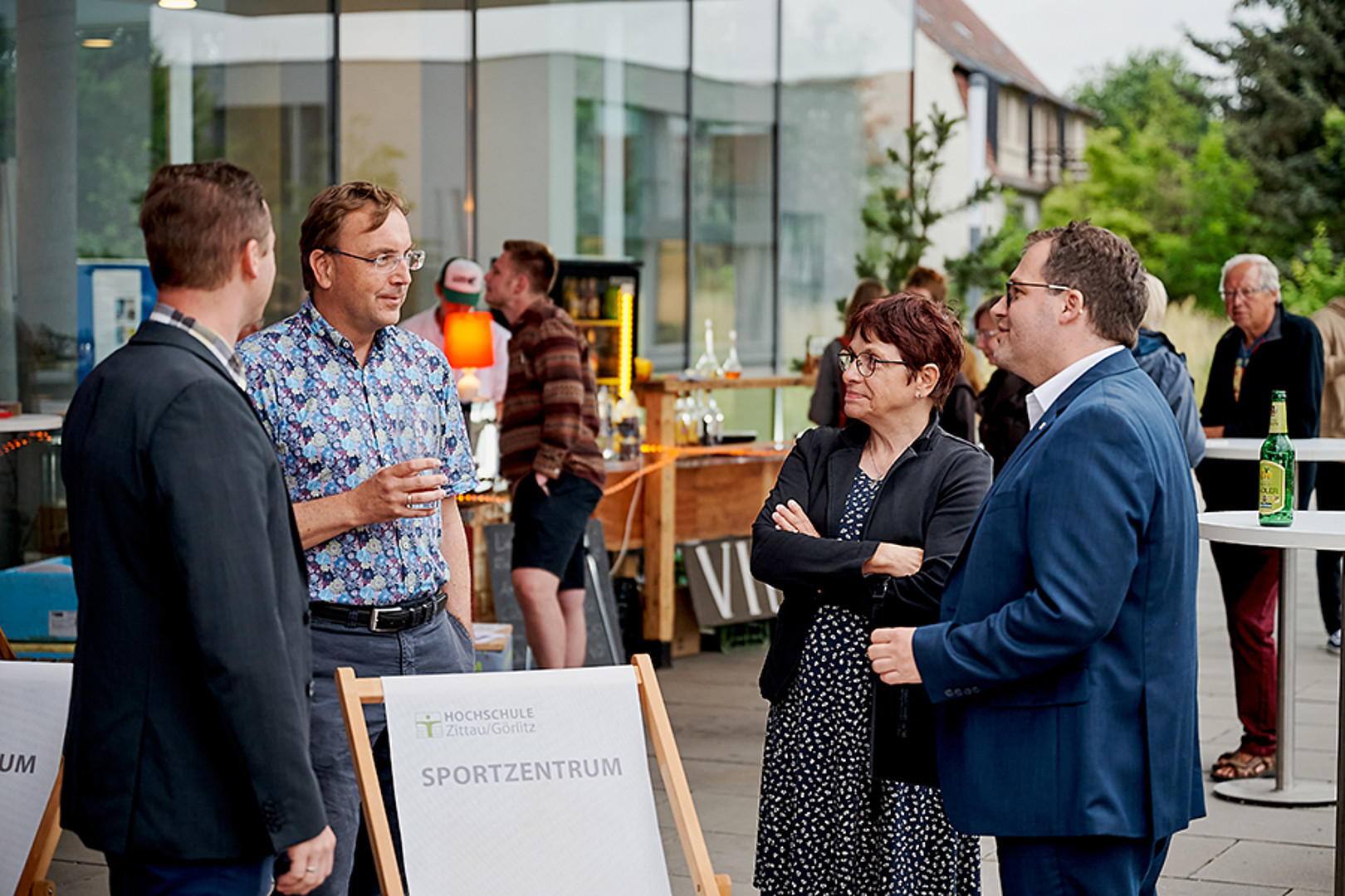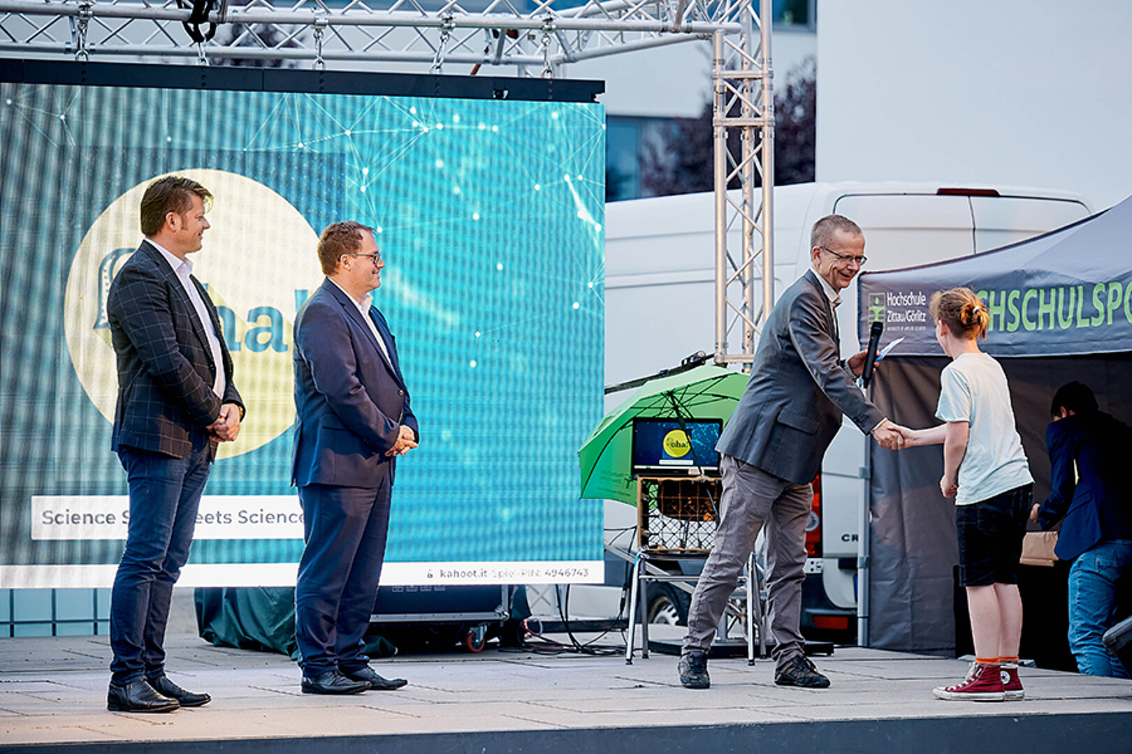 In Zittau war man mutiger. Trotz herannahender Regenwolke ging es 20 Uhr draußen auf dem Campusgelände los. Die Dramaturgie hätte nicht besser gewählt sein können. Pünktlich zu Prof. Webers Science-Slam „Oberflächlich spannend! Oder auch: Eine Geschichte über Wassertropfen.“ kamen sie dann auch – die Wassertropfen. Und da sie nicht nur auf der LED-Wand zu sehen, sondern auch auf den Köpfen zu spüren waren, erfolgte kurzerhand der Umzug in den nahen, rettenden Hörsaal. So konnten Science-Quiz und Science-Slams erfolgreich zu Ende gebracht werden, die Gäste fühlten sich sichtlich gut unterhalten und genossen im Anschluss feine Klänge unterm Hörsaal-Vordach – auch wenn es da schon gar nicht mehr regnete.