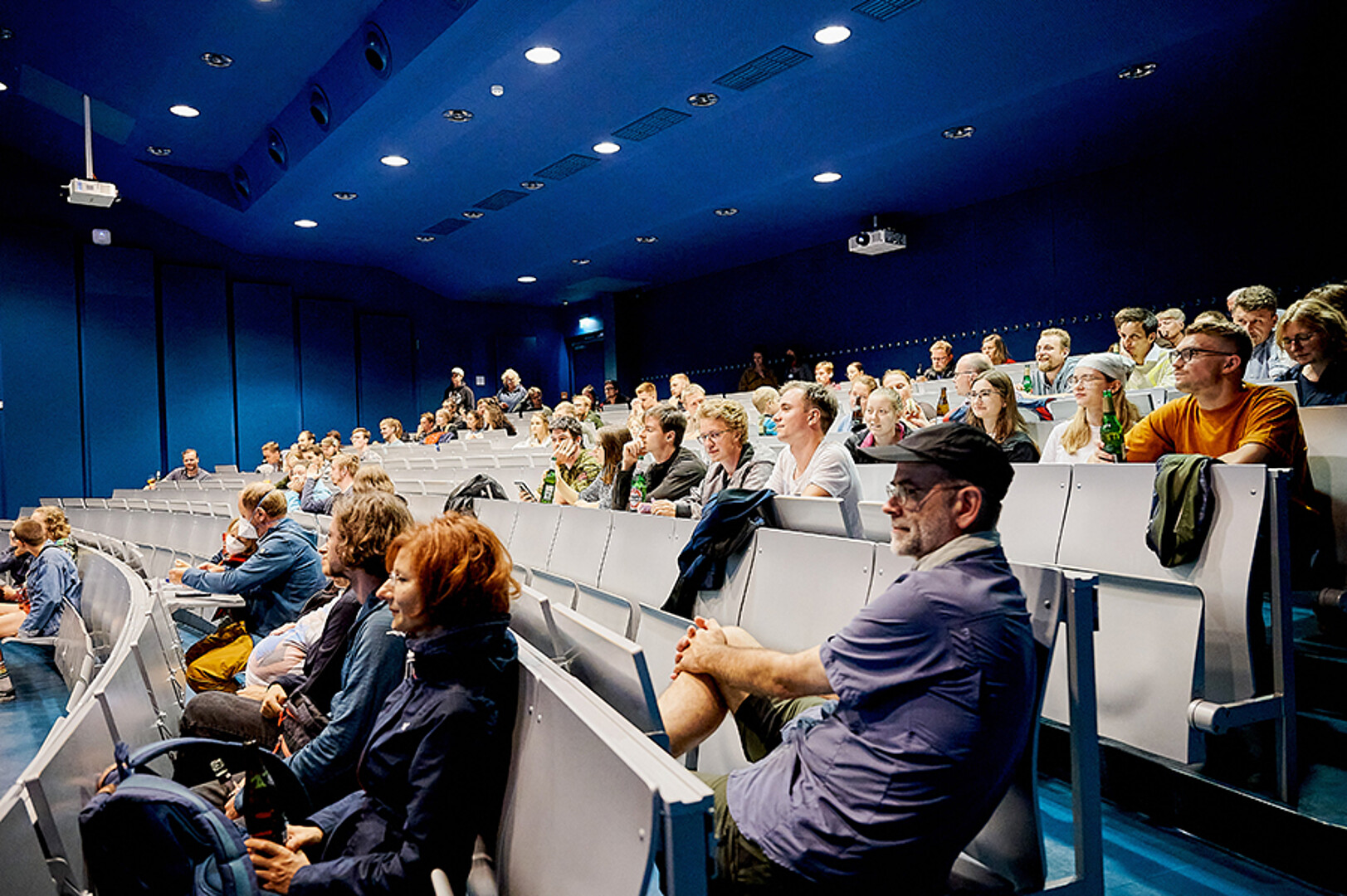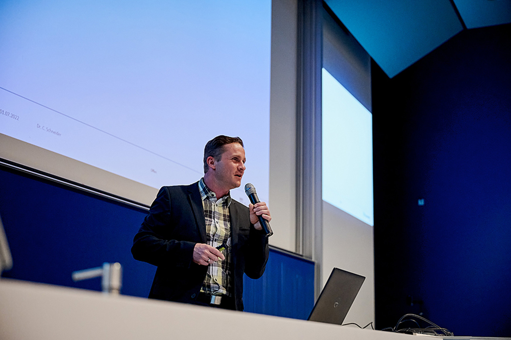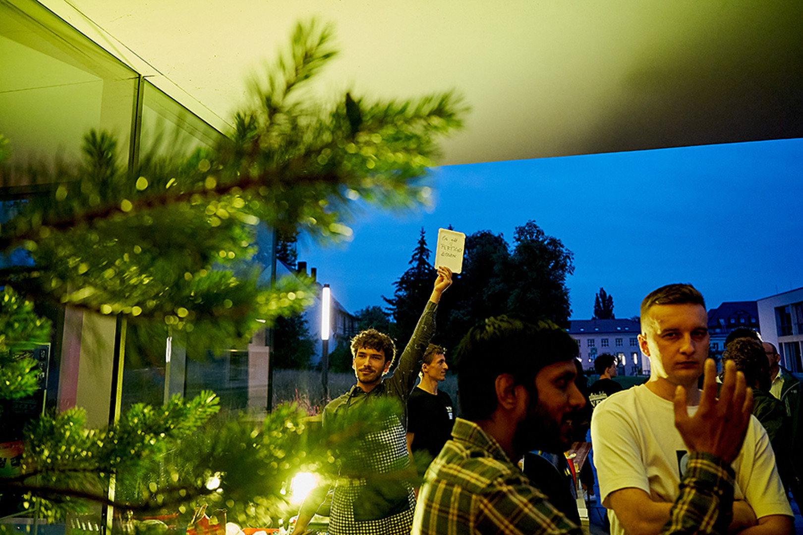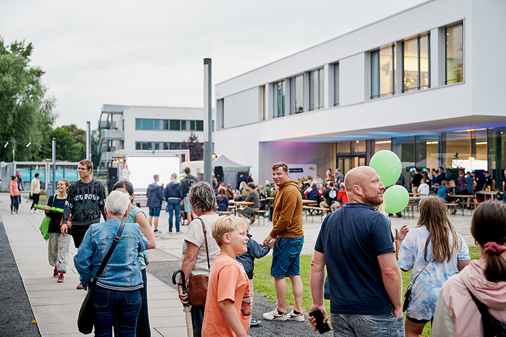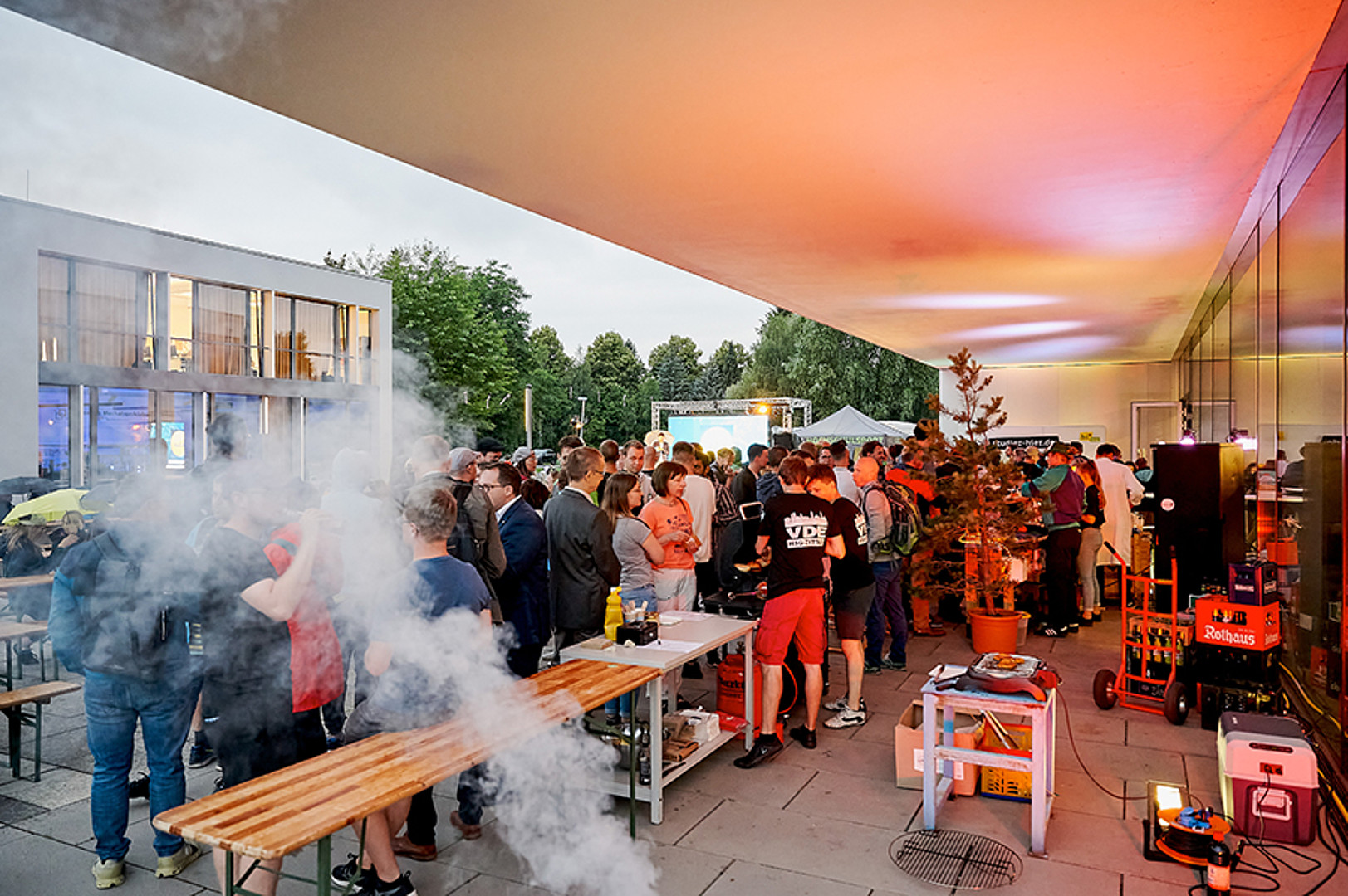 In Zittau war man mutiger. Trotz herannahender Regenwolke ging es 20 Uhr draußen auf dem Campusgelände los. Die Dramaturgie hätte nicht besser gewählt sein können. Pünktlich zu Prof. Webers Science-Slam „Oberflächlich spannend! Oder auch: Eine Geschichte über Wassertropfen.“ kamen sie dann auch – die Wassertropfen. Und da sie nicht nur auf der LED-Wand zu sehen, sondern auch auf den Köpfen zu spüren waren, erfolgte kurzerhand der Umzug in den nahen, rettenden Hörsaal. So konnten Science-Quiz und Science-Slams erfolgreich zu Ende gebracht werden, die Gäste fühlten sich sichtlich gut unterhalten und genossen im Anschluss feine Klänge unterm Hörsaal-Vordach – auch wenn es da schon gar nicht mehr regnete.