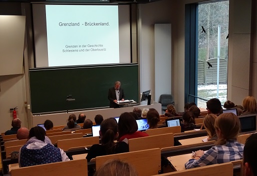 Im Rahmen des Programms eröffnete Dr. Markus Bauer (Direktor des Schlesischen Museums Görlitz) die Vorlesungsreihe am 22. März 2018 mit seinem Vortrag zum Thema "Grenzland − Brückenland. Grenzen in der Geschichte Schlesiens und der Oberlausitz". In dieser ersten von insgesamt acht Lesungen der Programmreihe ließen sich rund 40 Teilnehmer auf eine Zeitreise durch die Geschichte der Grenzen und Grenzüberschreitungen von Schlesien und der Oberlausitz ein.