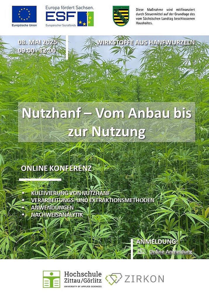Am 8. Mai 2025 fand im Rahmen des vom Europäischen Sozialfond (ESF) geförderten Nachwuchsforscherprojekts „Wirkstoffe aus Hanfwurzeln“ der erste Online-Workshop zum Thema „Nutzhanf – Vom Anbau bis zur Nutzung“ statt. Über 35 Teilnehmende aus Wissenschaft, Wirtschaft und weiteren Bereichen kamen zusammen, um sich über den aktuellen Stand der Forschung, innovative Anwendungsbeispiele und konkrete Herausforderungen rund um den Nutzhanf auszutauschen.