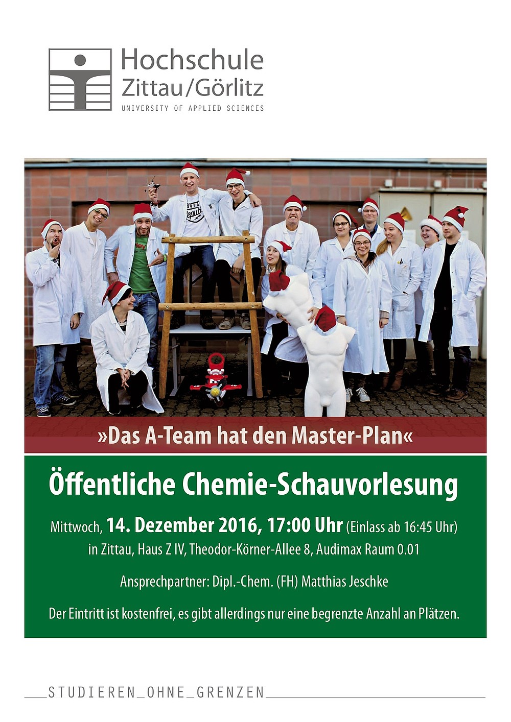 Die traditionelle, öffentliche Chemie-Schauvorlesung. Welchen Masterplan das A-Team verfolgt, offenbart sich am 14.12.2016 im großen Hörsaal (0.01) im Peter-Dierich-Haus (Theodor-Körner-Allee 8, Zittau).