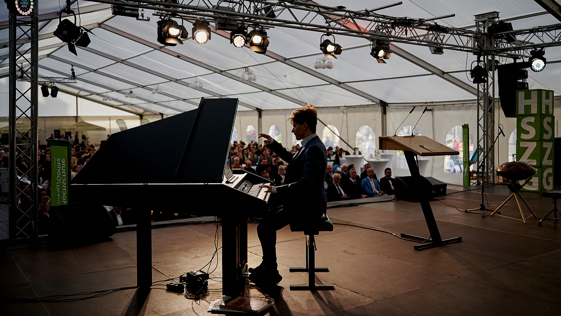 Gewohnt unterhaltsam führte das HSZG-Moderationsduo Carolin Renner (Studentin Management Sozialen Wandels) und Cornelius Baier (Absolvent Kultur und Management) durch den Festakt. Musikalisch umrahmt wurde dieser durch Informatik-Student Jonathan Zopf am Flügel, Cti Hang an der Hang Drum und der Sängerin Adriana Bessogonov