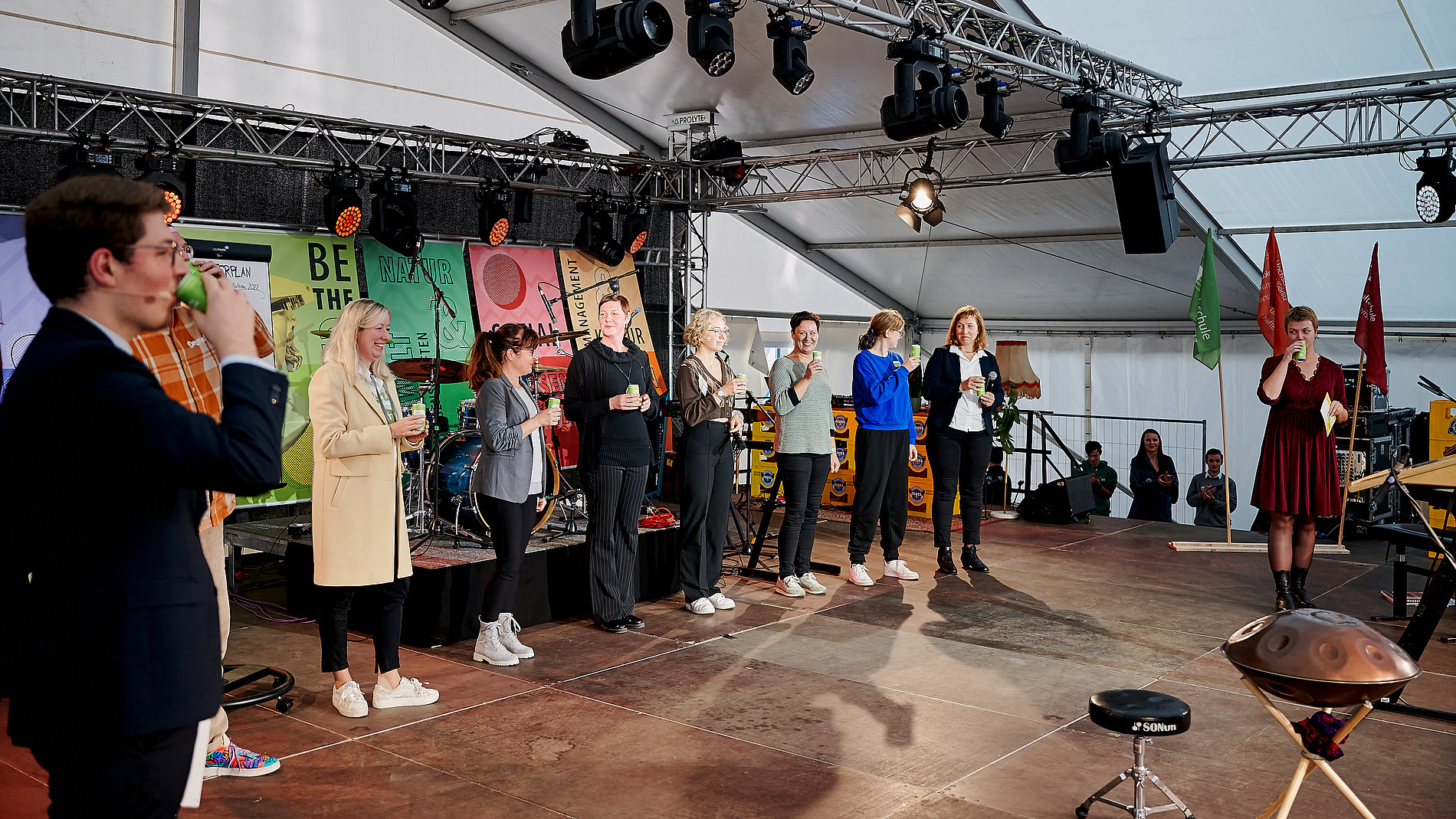 Den anschließenden Symbolischen Immatrikulationsakt übernahmen die Prorektorin für Bildung und Internationales Prof. Sophia Keil, Studienstarterin Lilliana Passeck (stellvertretend für alle Erstis...ein großes Dankeschön für deinen Mut), die Studienscouts der Fakultäten und eine Vertreterin des Studienkollegs. Grandioser Weise stiftete der Studierendenrat der HSZG (StuRa) pro Ersti eine Dose Prosecco, so dass im Nachgang alle gemeinsam auf das Studium anstoßen konnten.