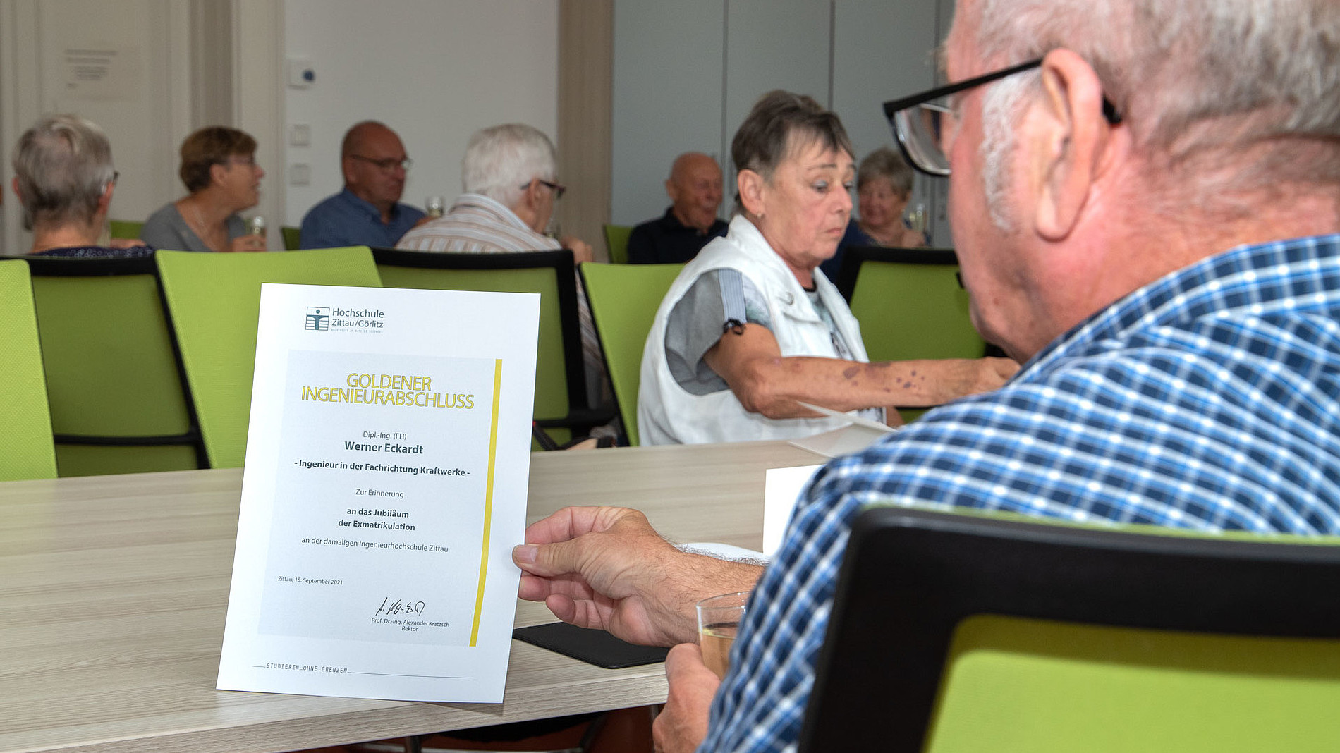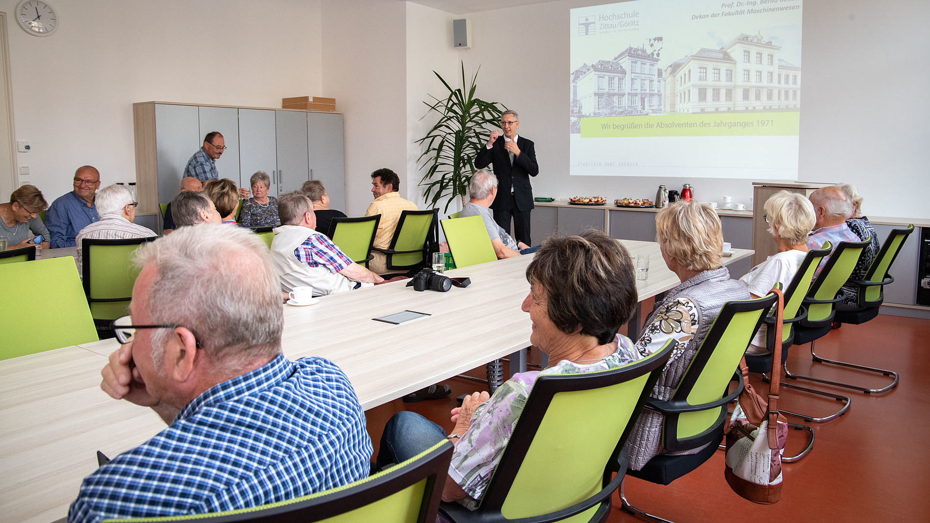 So auch eine Seminargruppe, die vor 50 Jahren ihren Ingenieurabschluss in Zittau ablegte. Sie wurden im Senatssaal der Hochschule vom Rektor, Herrn Prof. Dr.-Ing. Alexander Kratzsch, sowie vom Dekan der Fakultät Maschinenwesen, Herrn Prof. Dr.-Ing. Bernd Bellair, höchstpersönlich empfangen. Ein besonderes Highlight solcher Treffen ist die Übergabe der Goldenen Diplome.