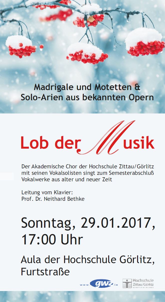 Der Akademische Chor der Hochschule Zittau/Görlitz und des Internationalen Hochschulinstitutes Zittau singt  am Sonntag, den 29. Januar 2017 um 17.00 Uhr in der Görlitzer Aula der Hochschule Zittau/Görlitz wieder sein traditionelles Semesterabschlußkonzert