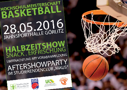 Am Samstag, den 28.05.2016 findet erstmalig die SHM Basketball für Frauen und Männer ab 10.00 Uhr in der Jahnsporthalle in Görlitz statt. Gemeinsam mit Basketballvereinen aus unserer Region, den Görlitzer BC Squirrels und den Zittauer Falcons, wollen wir ein unvergessliches Turnier für alle Teilnehmenden durchführen. Das Hochschulsportteam würde sich natürlich sehr freuen, wenn ihr die Auswahlmannschaften der Hochschule Zittau/Görlitz zu diesem Turnier als Zuschauer unterstützen könntet. Neben dem Turnier gibt es einige Highlights, wie eine Halbzeitshow, Preiskorbwerfen und ein große Aftershowparty in der Maus. Hier wollen wir mit allen Teams und natürlich mit euch nochmal richtig feiern. Auch das Mausteam hat sich passend zum Turnier einige Highlights für euch ausgedacht.