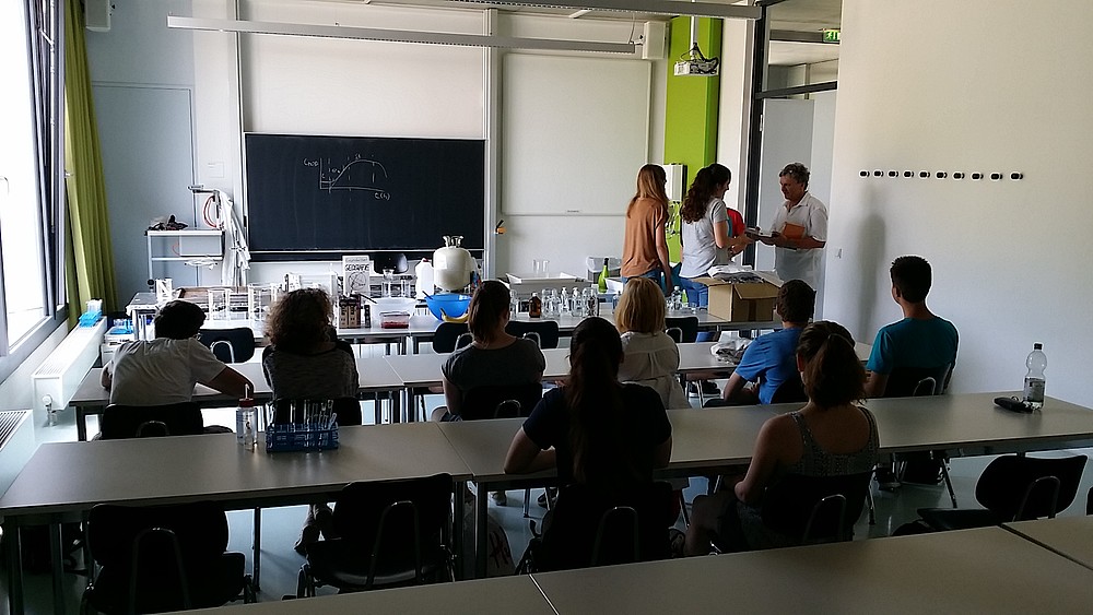 Emeritus Prof. Klaus Seibt diskutierte in einer Vorlesung das Thema "Löslichkeit von Gips". Die Schüler konnten anschließend das erlangte theoretische Wissen in Laborversuchen praktisch anwenden und die Ergebnisse des Versuchs gemeinsam mit dem Fachpersonal auswerten und diskutieren.