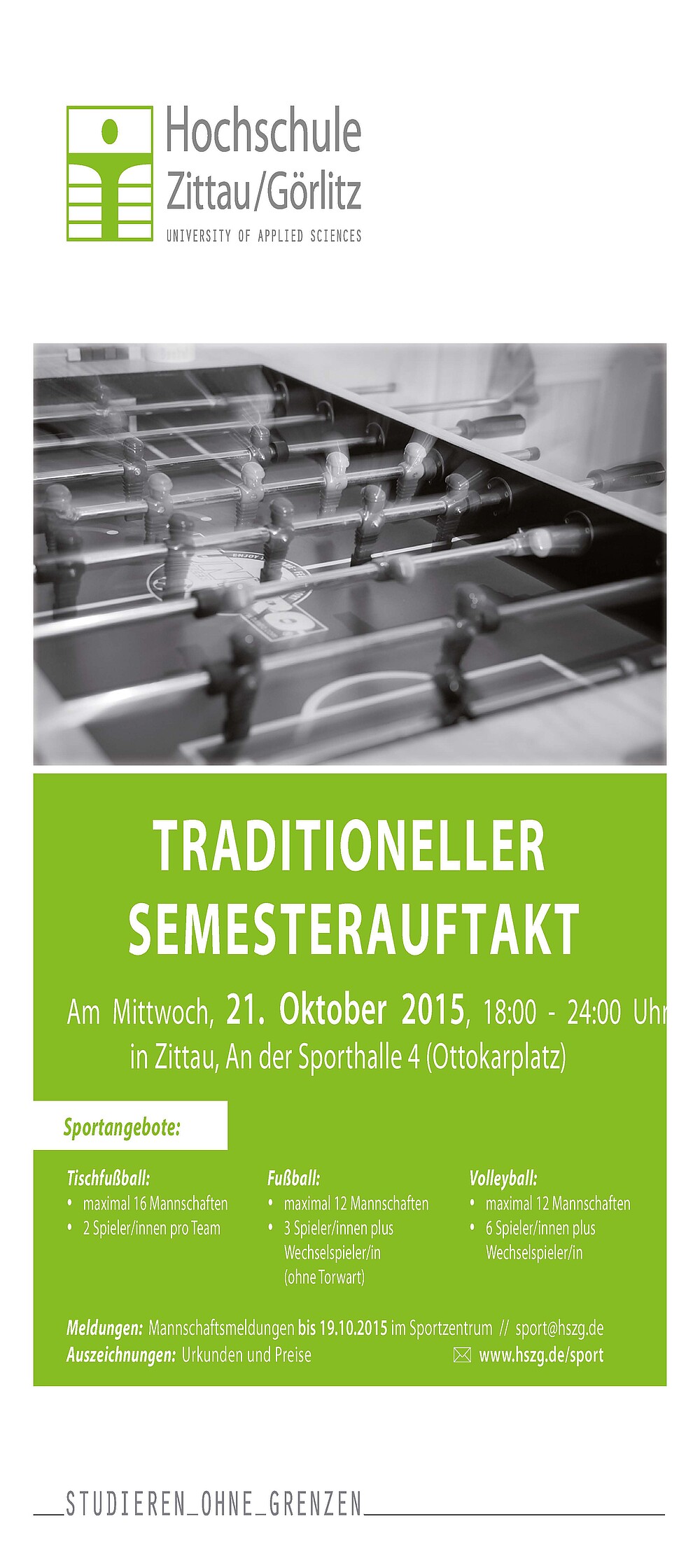 Am 21.10.2015 um 18.00 Uhr ist es wieder soweit. Das Hochschulsportzentrum lädt euch herzlich zum sportlichen Semestereröffnungsturnier ein. Es wird wieder ein Fußball-, Volleyball- und Tischfußballturnier veranstaltet, an dem 12 Mannschaften pro Sportart teilnehmen können. Das Turnier findet wieder in der schönen Ottokar-Sporthalle in Zittau statt. Natürlich bietet die Dezibar wieder Getränke und Snacks zum schmalen Taler an. Wir freuen uns auf zahlreiche TeilnehmerInnen und Zuschauerinnen.