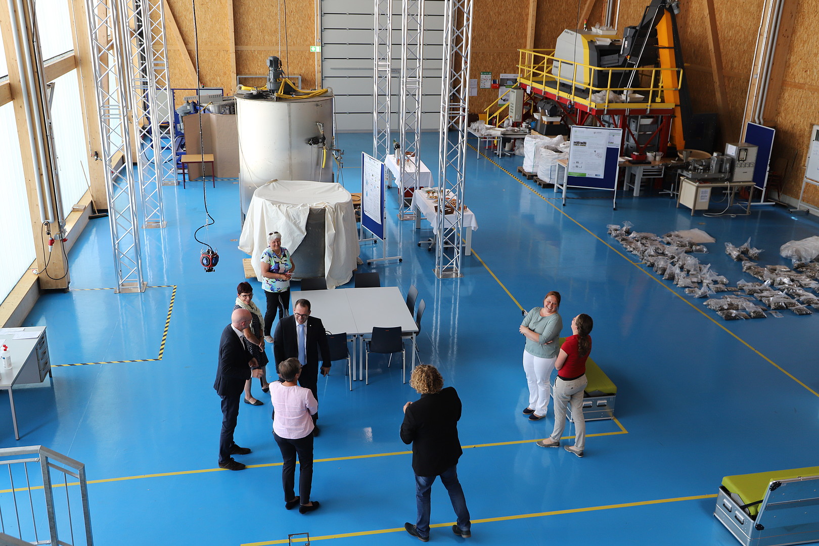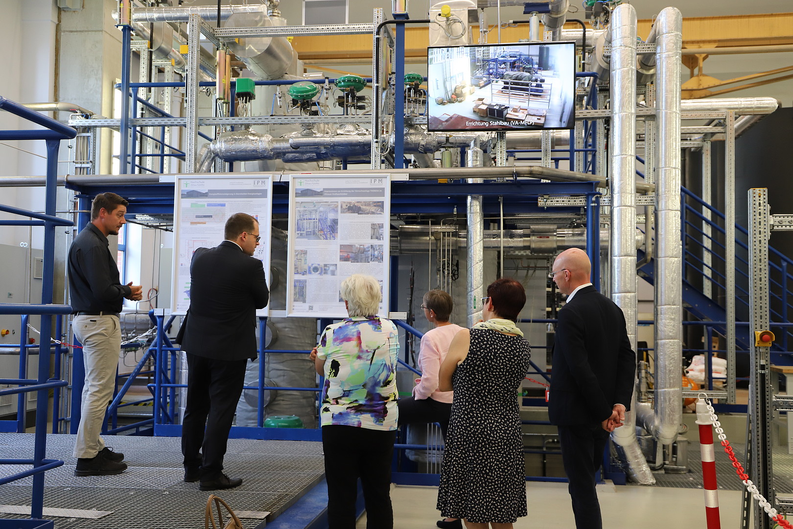 Abschluss des Besuches bildete das Zittauer Kraftwerkslabor. Sebastian Braun, Fachgebietsleiter im Institut für Prozeßtechnik, Prozeßautomatisierung und Meßtechnik (IPM), führte durch das Labor und erläuterte die dort installierten Großversuchsanlagen. Des Weiteren stellte er künftige Forschungsvorhaben vor. Frau Franke stellte interessiert Fragen zu Prozessen der Energieeffizienzsteigerung und zur Verwertung der Forschungsergebnisse, die praktische Anwendung von Erkenntnissen aus den Forschungsvorhaben sowie zur Zusammmenarbeit mit Unternehmen. Besonderes Interesse zeigte sie an der Flexibilisierung von Energieanlagen mit Thermischen Energiespeichern und diskutierte diese Thematik sowie neue Forschungsvorhaben mit Sebastian Braun und Prof. Alexander Kratzsch.