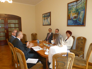 Die Kanzlerin der Riesengebirgshochschule, Frau Grażyna Malczuk lud die Gäste am Vormittag zur Beratung in den Senatssaal ein. Neben der Kanzlerin nahmen Frau Kamila Biniek, Herr Doz. Dr. Józef Zaprucki und Herr Bibliotheksdirektor Kazimierz Stapór von polnischer Seite und Herr Dr. Falk Maiwald, Herr Kazimierz Jarema und Herr Ralf Schwarzbach von unserer Hochschule teil.