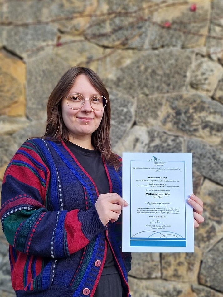 Für ihre Masterarbeit im Studiengang Management Sozialen Wandels der Fakultät Sozialwissenschaften der HSZG ist Marina Martin mit dem Masterarbeitspreis der Deutschen Gesellschaft für Sozialmedizin und Prävention (DGSMP) ausgezeichnet worden. Betreut wurde die Arbeit mit dem Titel „Das Gesundheitswesen im Spannungsfeld zwischen Vertrauen und Verschwörungstheorien“ von Prof.in Nadine Jukschat.