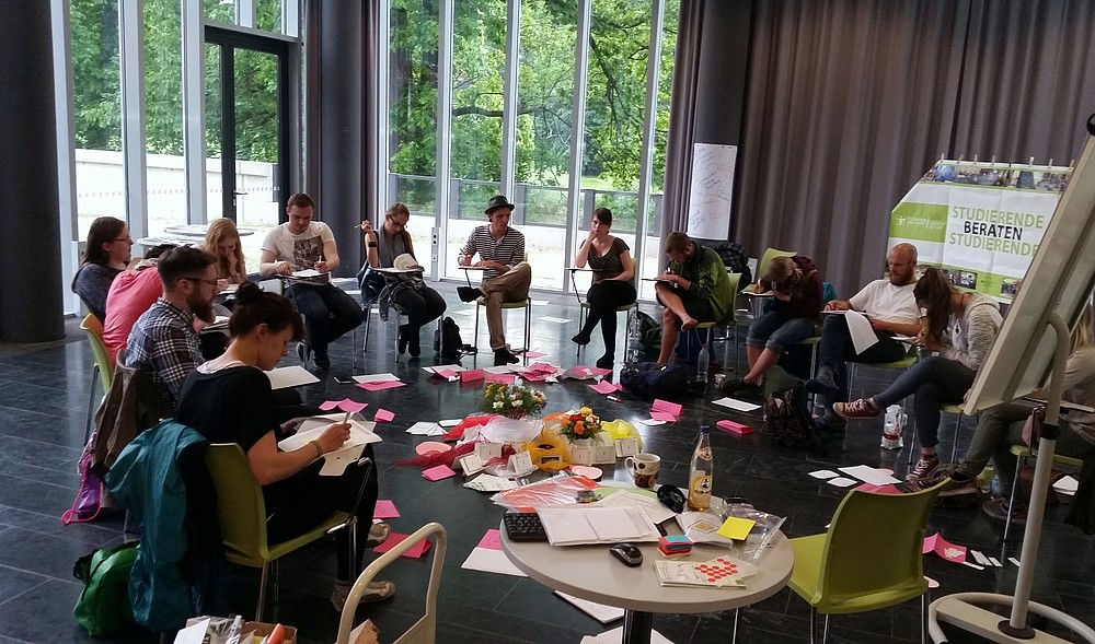 Nach der erfolgreichen Akquise zu Beginn des Sommersemesters 2015 haben 48 neue studentische Studienberaterinnen ihre Arbeit begonnen. Sie sind nun studentische Ansprechpartner/innen für Fragen, Schwierigkeiten und Hilfe für die kommenden Erstsemesterstudierenden. Im Mai begannen an beiden Standorten im Rahmen der Qualifizierungsmaßnahmen verschiedene Workshops, in denen es - neben typischen Studierendenproblemen, dem Kennenlernen des Unterstützungsnetzwerkes inner- und außerhalb der Hochschule – auch um Beratung und Gesprächsführung ging. Weitere Workshops bearbeiten dann mit Unterstützung von Hochschulangehörigen und dem Studentenwerk die verschiedenen Aufgaben- und Themengebiete Prüfung, akademische Verwaltung, Studienfinanzierung, Beratungsangebote sowie psychosoziale Beratung.
