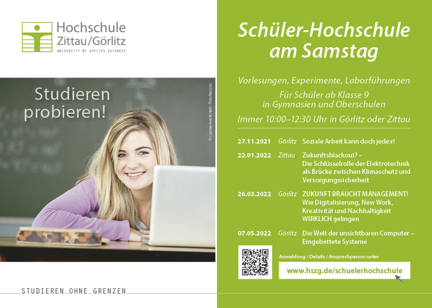 Für die Teilnahme ist im Vorfeld eine Online-Anmeldung erforderlich. Den Link zur Anmeldung, die Lagepläne des Campus Zittau und des Campus Görlitz sowie alle Informationen rund um die „Schüler-Hochschule am Samstag“ gibt es unter www.hszg.de/schuelerhochschule. Wir freuen uns auf interessierte Schüler*innen!