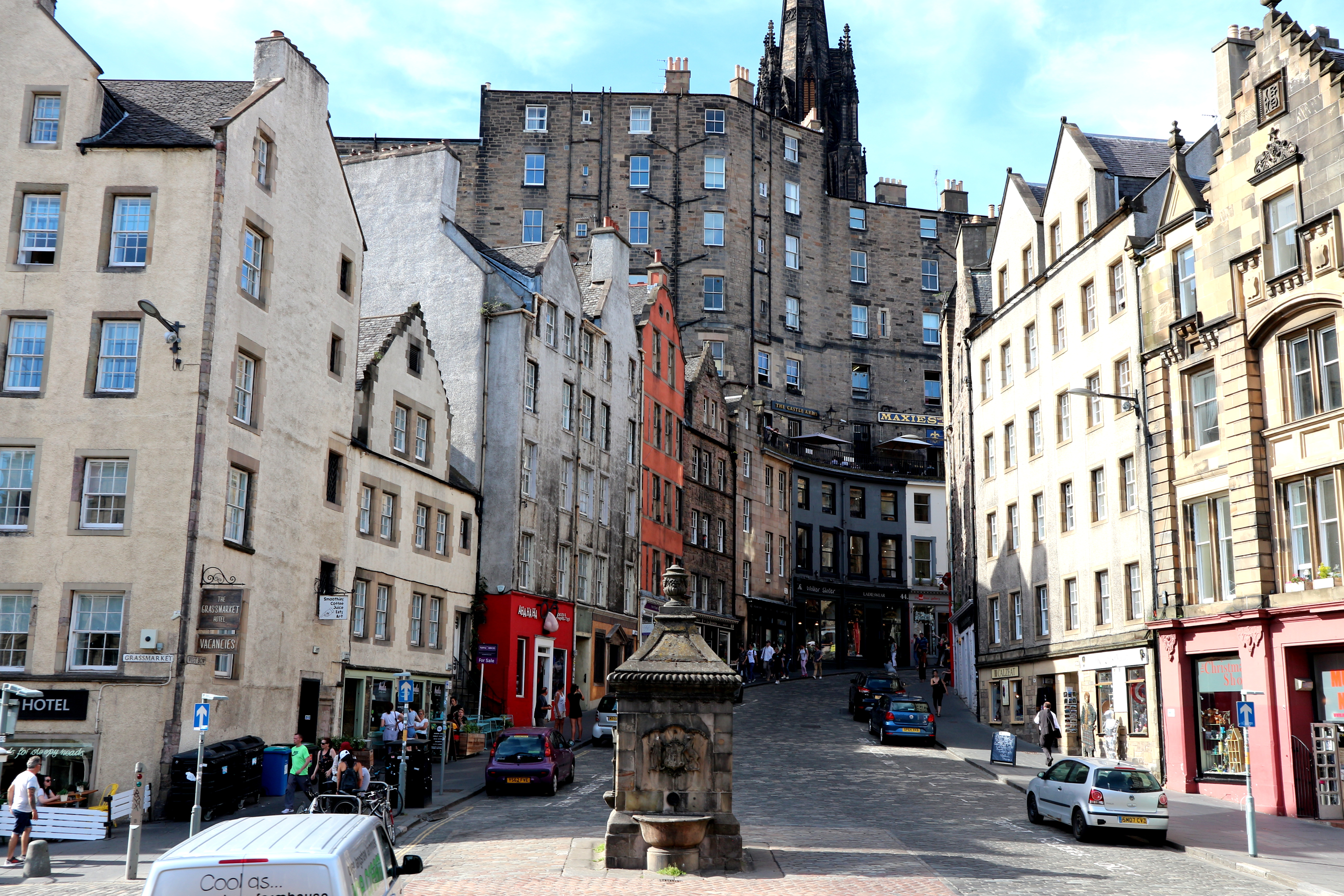 In der Hauptstadt erwartet uns erstmal etwas Unerwartetes – Sonnenschein. Und es ist richtig warm. Ich löse ein Ticket für den Shuttlebus und dann kann es endlich in Richtung Stadtzentrum gehen. Dort werden wir mit den Klängen eines Dudelsacks am Welverly Place empfangen. Ich nutze gleich die Gelegenheit um mein mitgebrachtes Bargeld in Pfund umzutauschen. Leider hatte ich beim Ticketkauf für den Bus das Problem, dass meine mitgebrachten Pfundmünzen nicht angenommen wurden. Diese hatte ich noch aus früheren Großbritannienreisen meiner Familie.  Nach einem 20 minütigen Fußmarsch mit Sack und Pack erreichen wir  dann unser Hostel, das Destiny Student Brae House. Circa 30 Euro kostet da eine Übernachtung im Doppelzimmer mit Bad. Die Küche teilen wir uns untereinander, da meine insgesamt 9 Kommilitonen und ich alle zusammen in ein Appartement mit 5 Doppelzimmern passen. Alles in allem eine gute Unterkunft zum moderaten Preis, die gerade einmal 10 Minuten zu Fuß vom Stadtkern entfernt liegt. Nachdem wir uns eingerichtet und einen Abstecher zur nicht weit entfernten Kaufhalle gemacht haben, laufen wir zum Holyrood Palace, die offizielle Residenz der Queen in Schottland. Von dort aus starten wir eine Hop-on Hop-off Tour.  Viele von euch kennen das sicher: Man macht eine Stadtrundfahrt bei der man allerdings die Möglichkeit hat unterwegs auszusteigen und sich umzusehen. Später kann man mit einem anderen Bus weiterfahren. Am grassmarket gibt es viele verschiedene Pubs und Restaurants, wo man auch draußen sitzen kann. Wir nutzen die Gelegenheit und verbringen in einem der Pubs den Abend. Da Haggis ein typisch schottisches Gericht ist, müssen wir das natürlich ausprobieren. Haggis ist ein mit Innereien gefüllter Schafsmagen. Klingt eklig, geht aber. Wir probieren es als „Pie“, also eine Art gefüllter (in dem Fall mit Haggis) Kuchen.[caption id="attachment_1123" align="aligncenter" width="5184"] Grassmarket im Zentrum der Stadt unterhalb Edinburgh Castle[/caption]