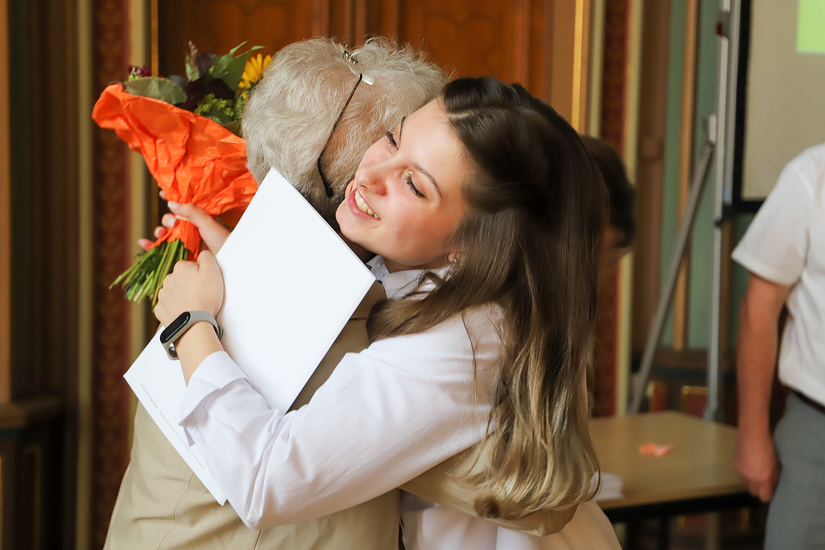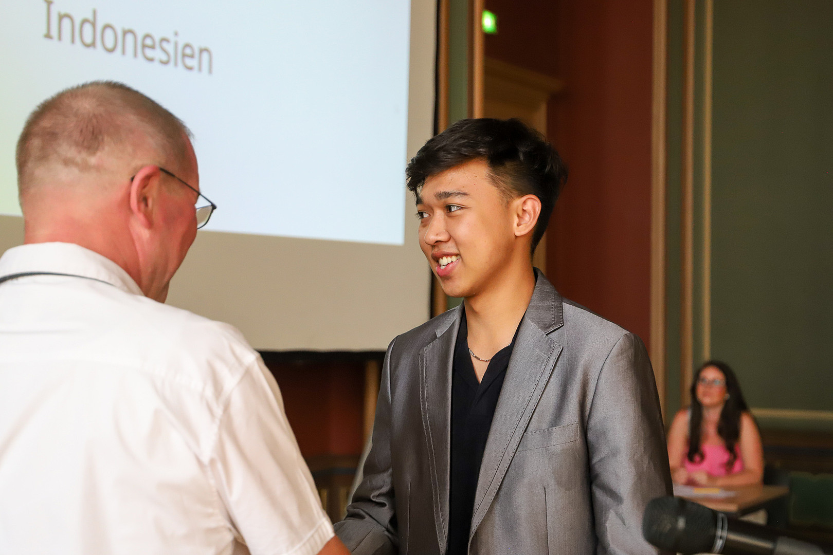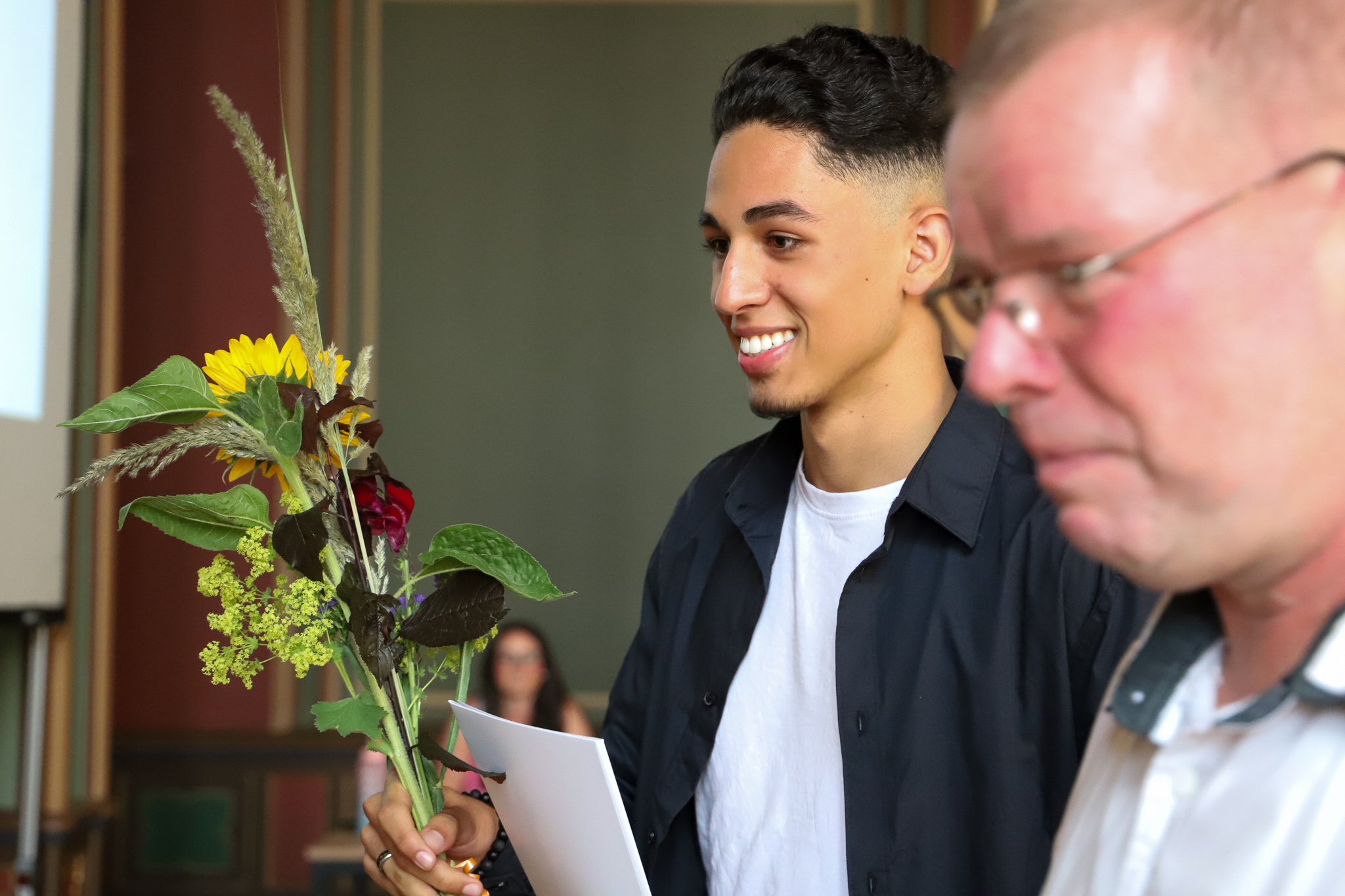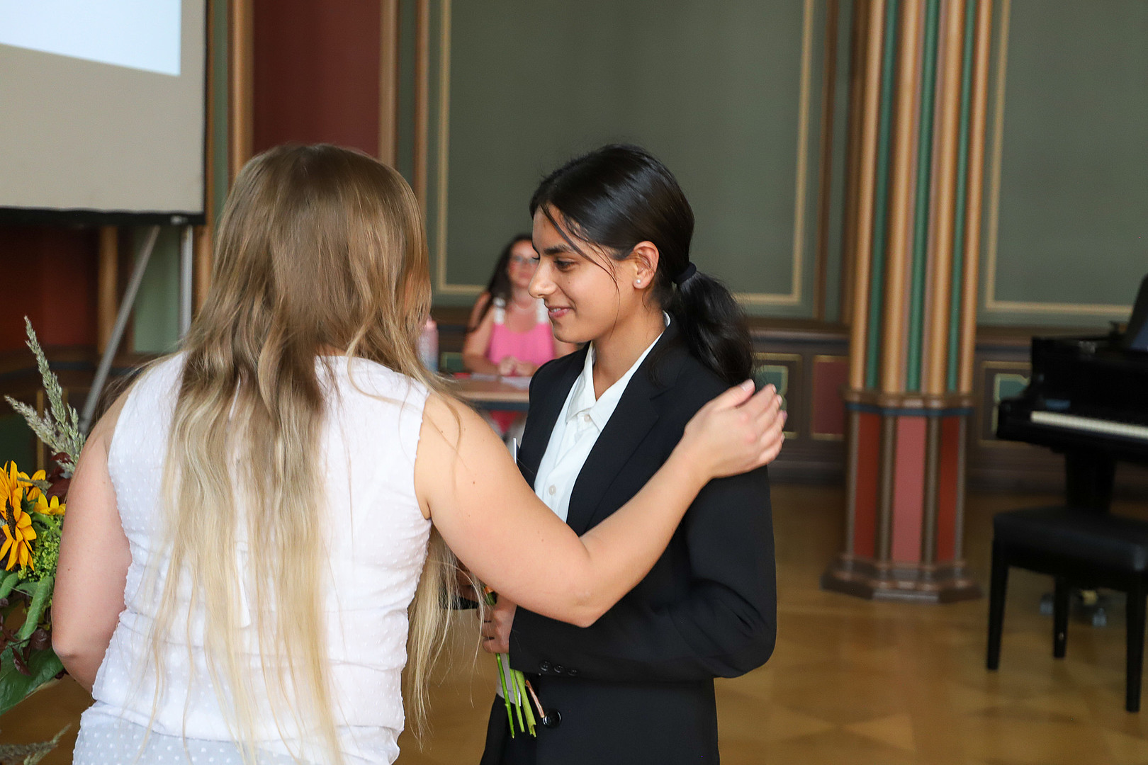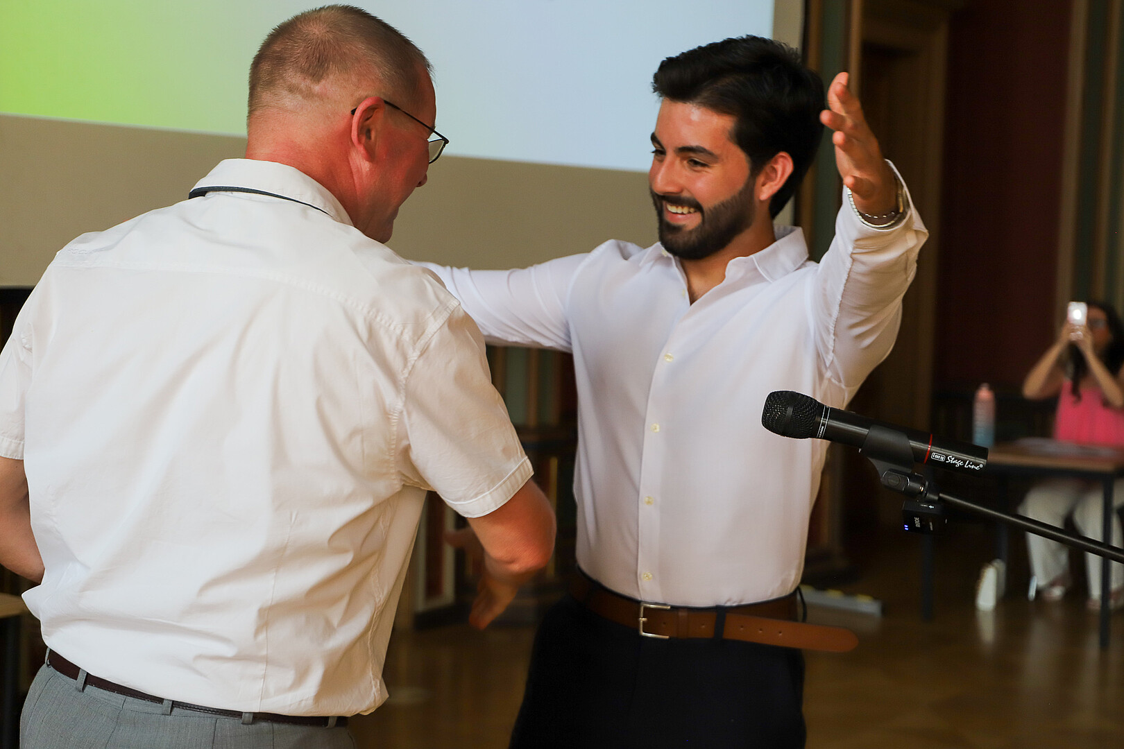 Als nach Grußworten, musikalischen Beiträgen und der Ehrung des langjährigen Leiters des Studienkollegs Dr. Stefan Kühne, der Moment der Zeugnisausgabe gekommen ist, erreicht die emotionale Stimmung ihren Höhepunkt. Die Lehrkräfte des Studienkollegs richten Botschaften an ihre Zöglinge in deren Muttersprache. Die gerührten Gesichter der jeweils angesprochenen Nationalitäten: Unbezahlbar! Spätestens jetzt wird klar: Hier wurde nicht nur gelehrt, sondern hier wurde begleitet, unterstützt, motiviert und mitgefiebert. Die Kollegiat*innen und die Hochschulmitarbeitenden sind eine eine große Familie! Die Dankbarkeit der jungen Menschen wird bei der anschließenden Übergabe der Zeugnisse erlebbar. Es gibt viele Umarmungen und dankbare Blicke.