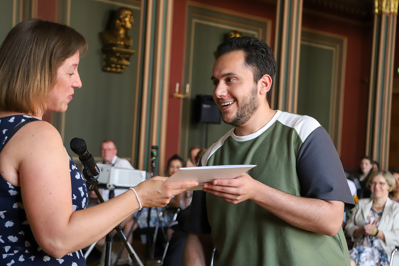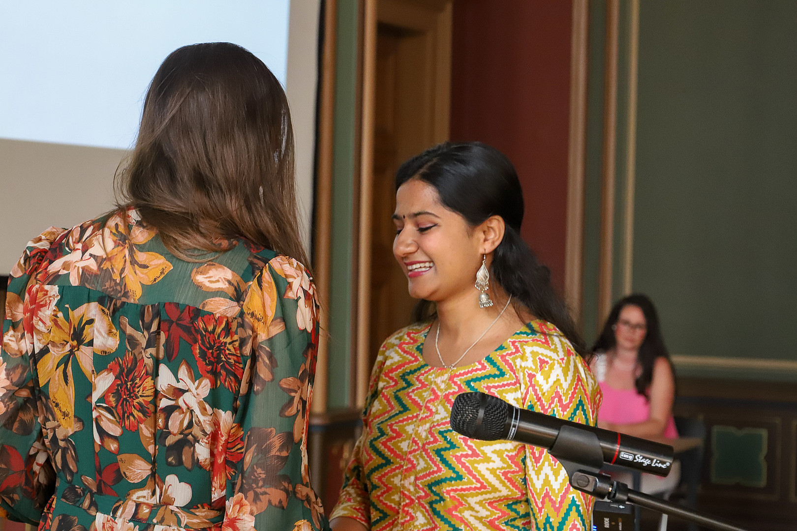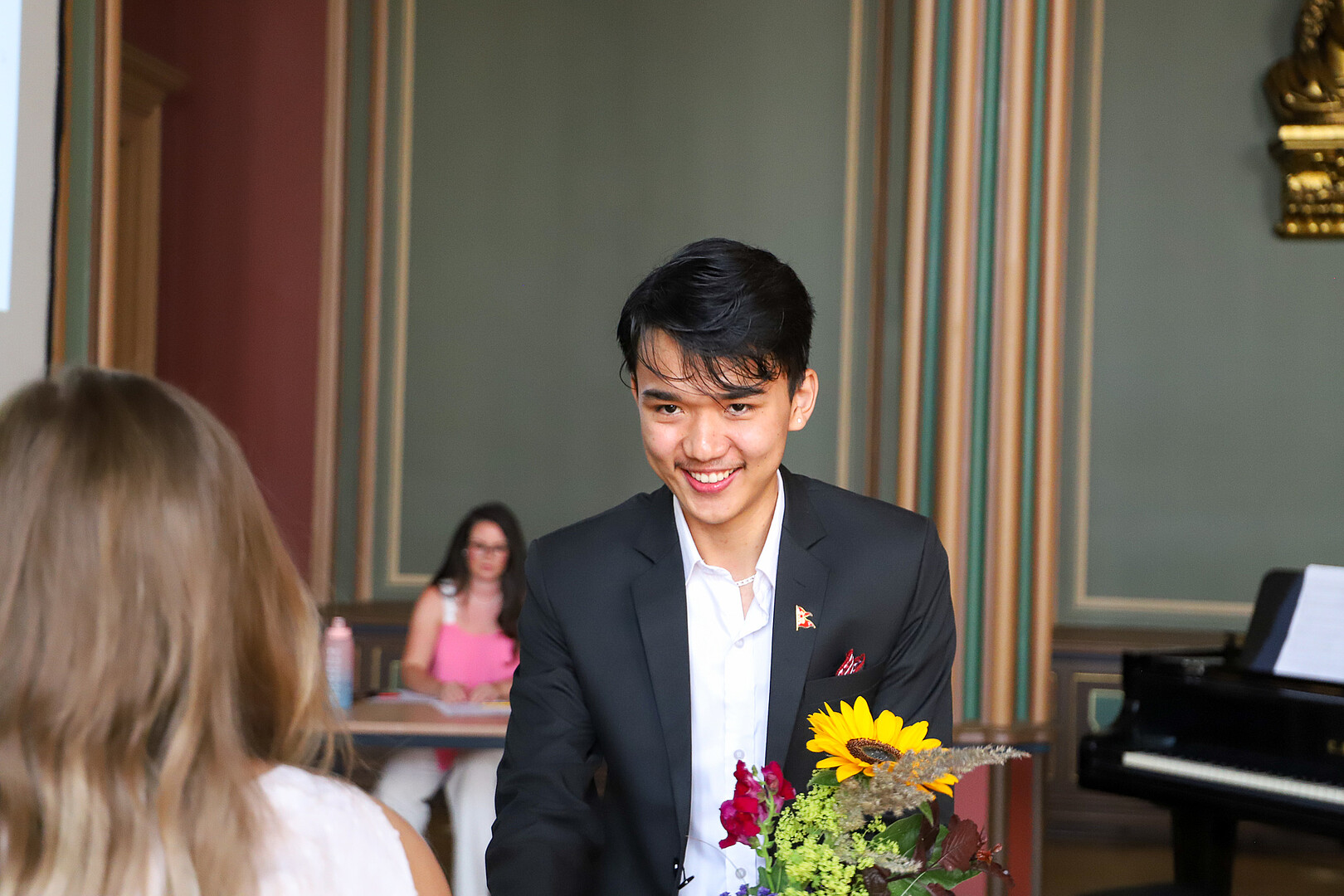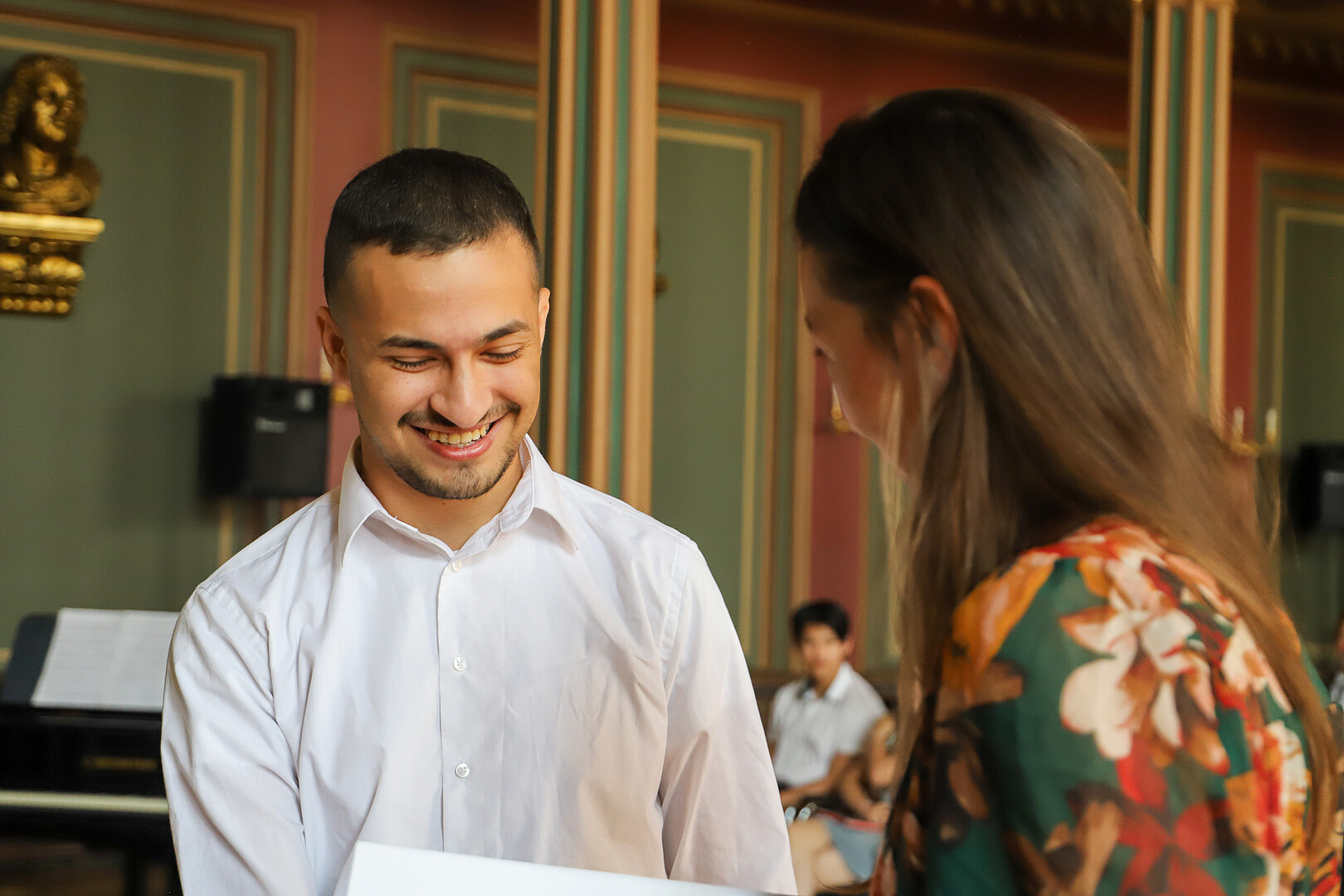 Als nach Grußworten, musikalischen Beiträgen und der Ehrung des langjährigen Leiters des Studienkollegs Dr. Stefan Kühne, der Moment der Zeugnisausgabe gekommen ist, erreicht die emotionale Stimmung ihren Höhepunkt. Die Lehrkräfte des Studienkollegs richten Botschaften an ihre Zöglinge in deren Muttersprache. Die gerührten Gesichter der jeweils angesprochenen Nationalitäten: Unbezahlbar! Spätestens jetzt wird klar: Hier wurde nicht nur gelehrt, sondern hier wurde begleitet, unterstützt, motiviert und mitgefiebert. Die Kollegiat*innen und die Hochschulmitarbeitenden sind eine eine große Familie! Die Dankbarkeit der jungen Menschen wird bei der anschließenden Übergabe der Zeugnisse erlebbar. Es gibt viele Umarmungen und dankbare Blicke.