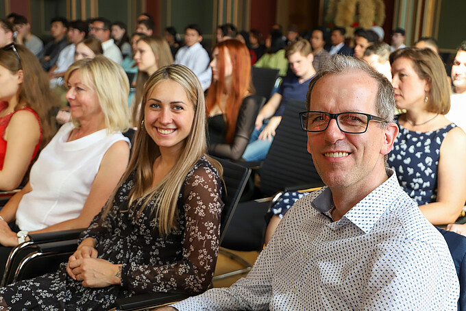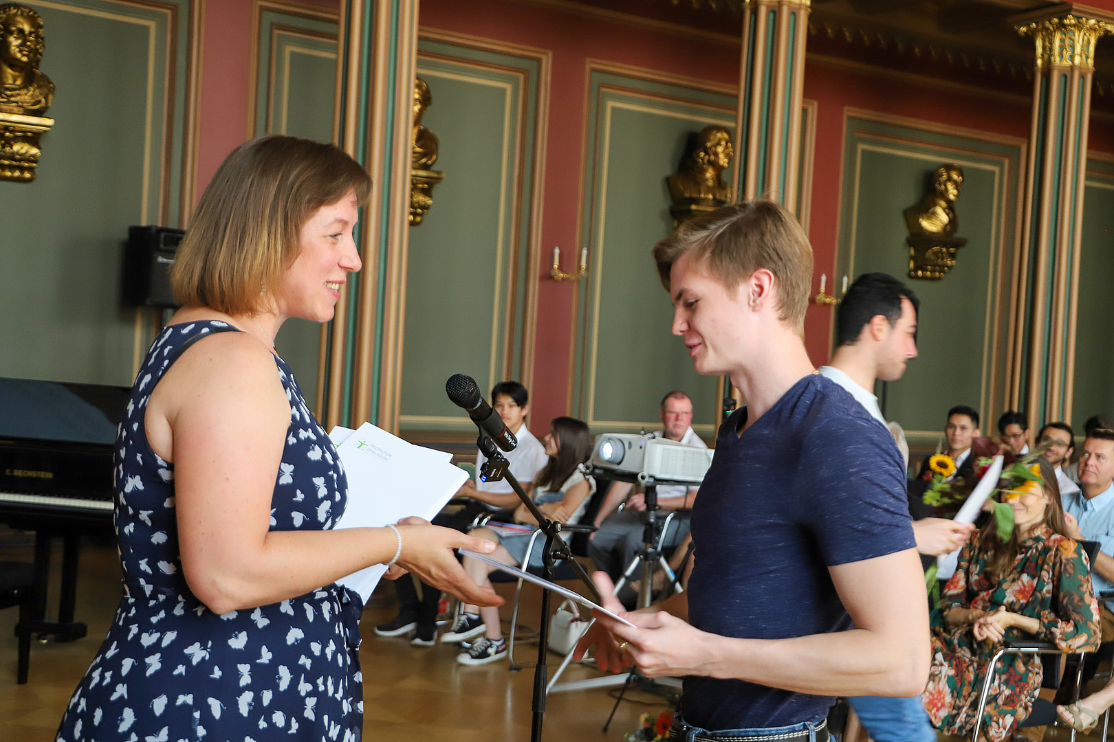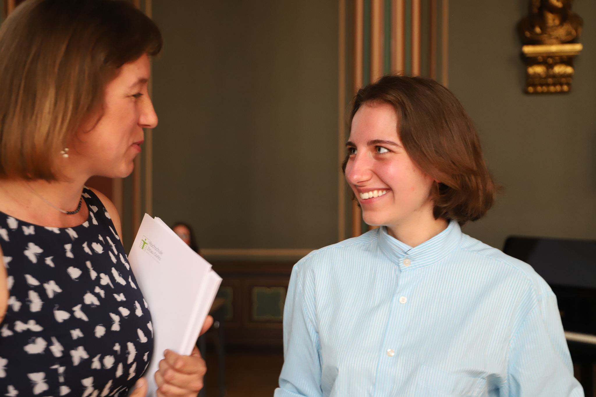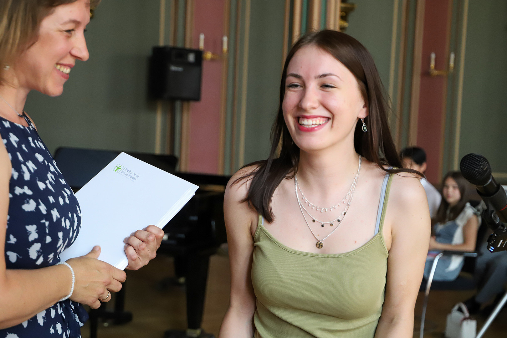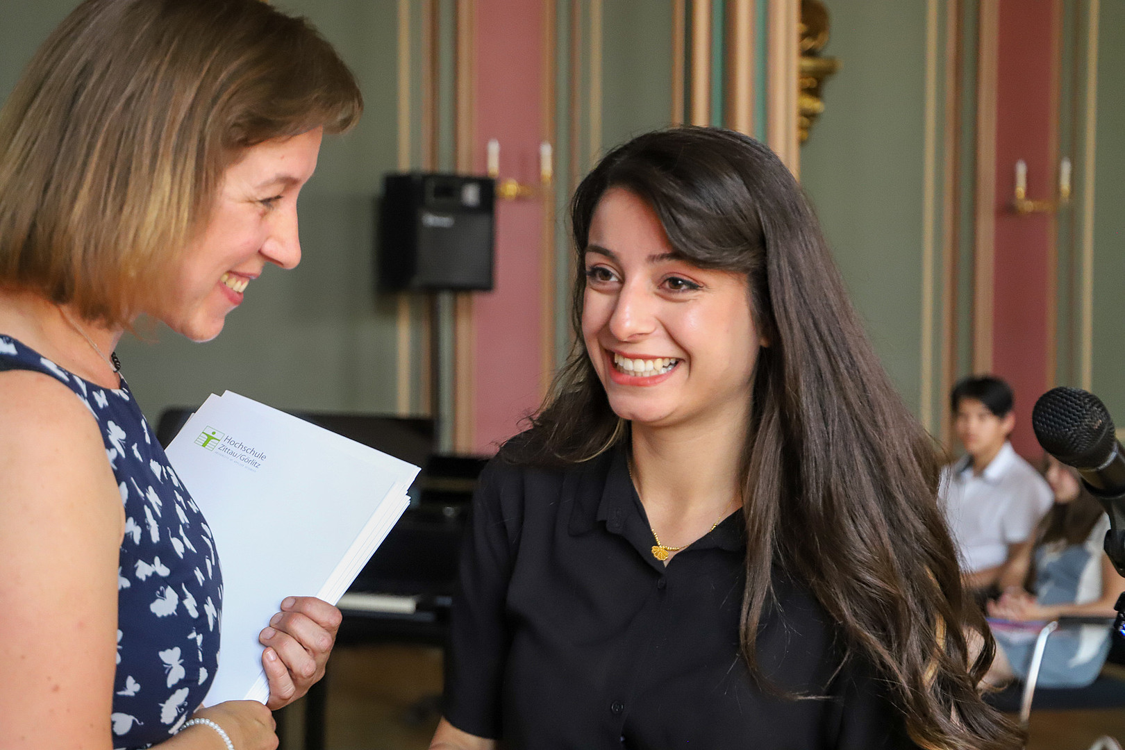 Als nach Grußworten, musikalischen Beiträgen und der Ehrung des langjährigen Leiters des Studienkollegs Dr. Stefan Kühne, der Moment der Zeugnisausgabe gekommen ist, erreicht die emotionale Stimmung ihren Höhepunkt. Die Lehrkräfte des Studienkollegs richten Botschaften an ihre Zöglinge in deren Muttersprache. Die gerührten Gesichter der jeweils angesprochenen Nationalitäten: Unbezahlbar! Spätestens jetzt wird klar: Hier wurde nicht nur gelehrt, sondern hier wurde begleitet, unterstützt, motiviert und mitgefiebert. Die Kollegiat*innen und die Hochschulmitarbeitenden sind eine eine große Familie! Die Dankbarkeit der jungen Menschen wird bei der anschließenden Übergabe der Zeugnisse erlebbar. Es gibt viele Umarmungen und dankbare Blicke.
