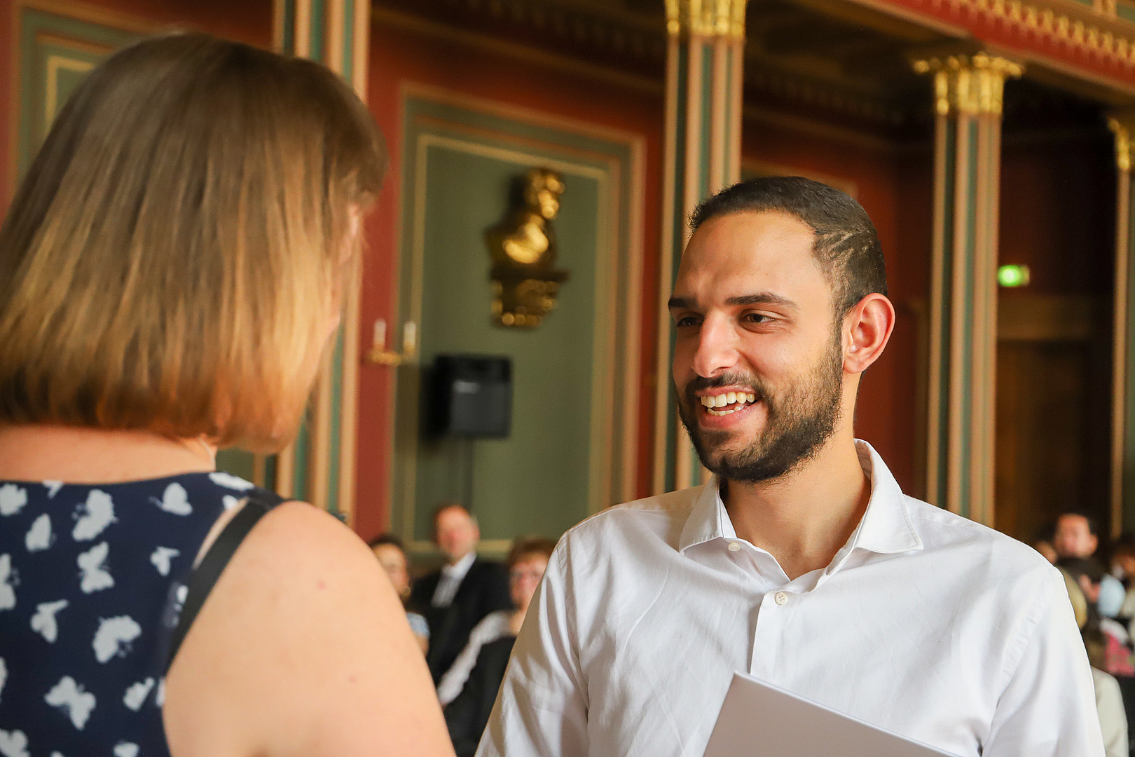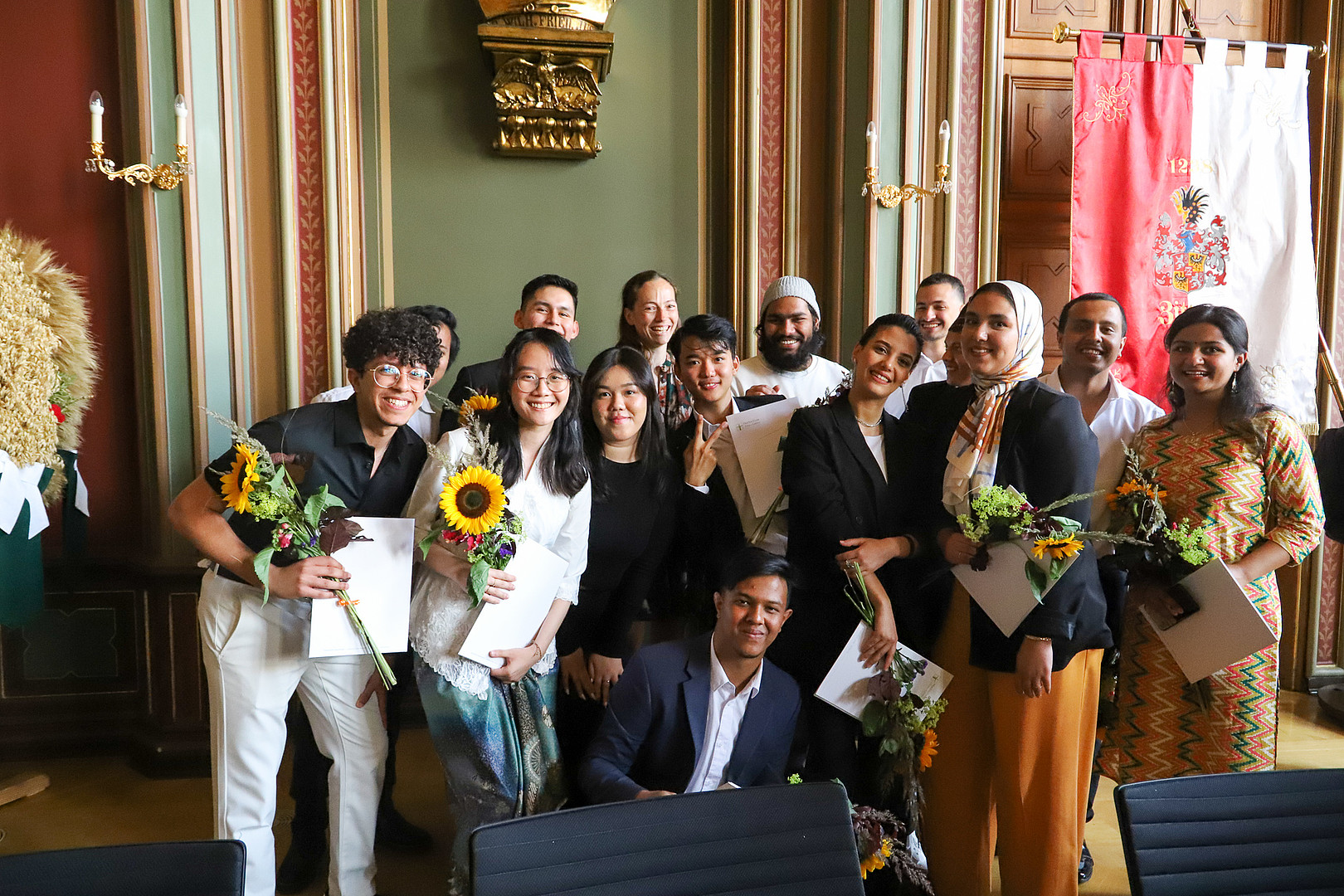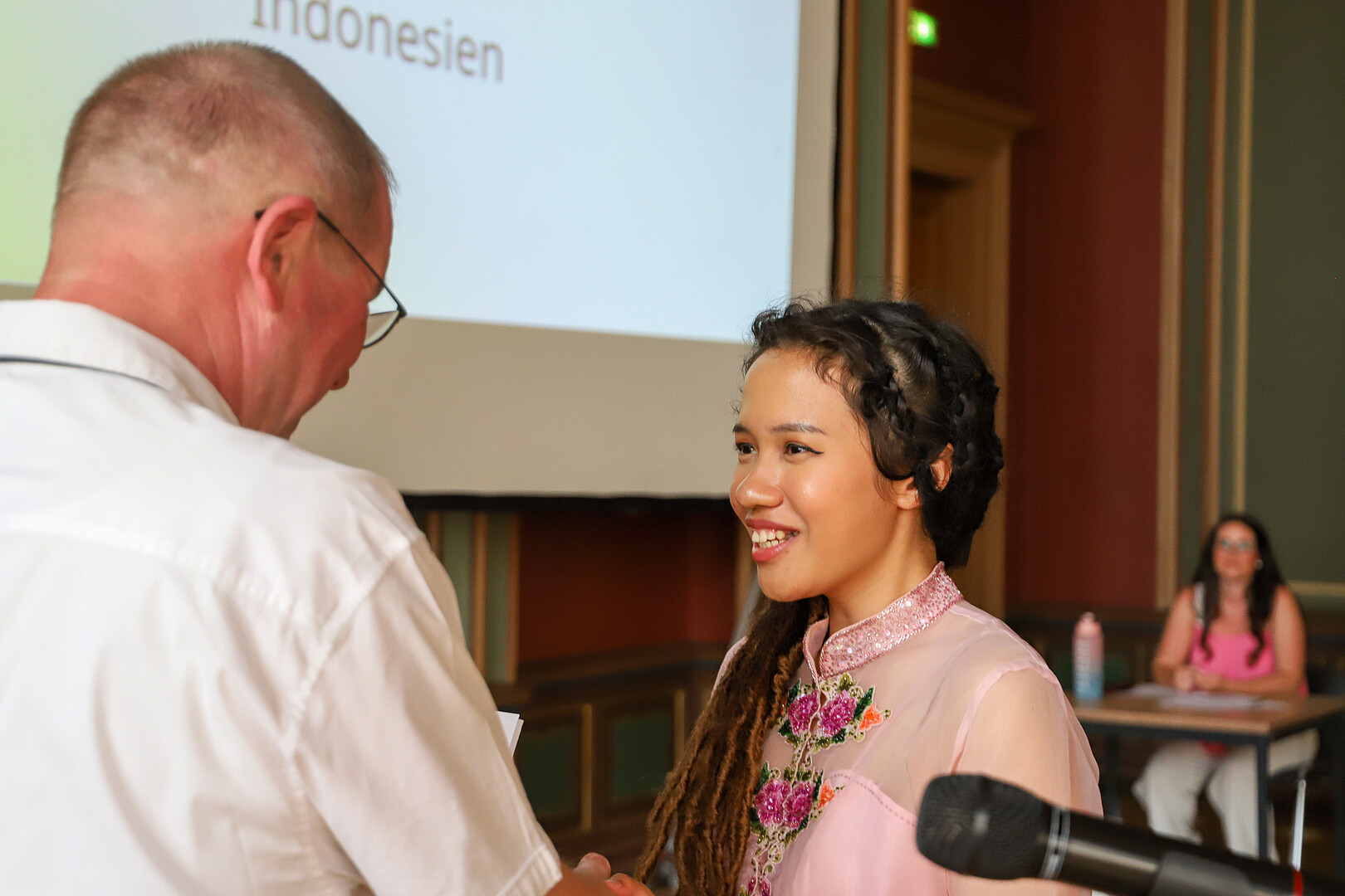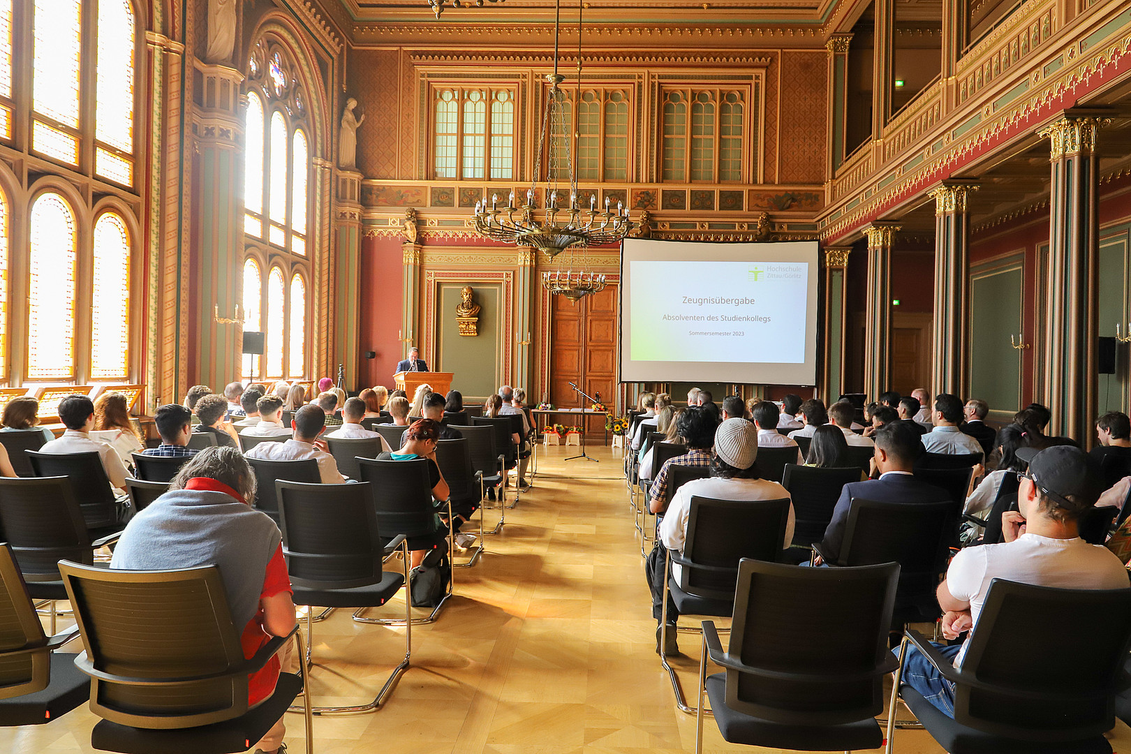 Im Bürgersaal des Zittauer Rathauses herrscht eine ausgelassene, freudige Stimmung. 46 junge Menschen aus 16 verschiedenen Ländern haben sich schick gemacht und sind voller Stolz auf einen besonderen Moment gespannt: die Zeugnisausgabe des Studienkollegs der Hochschule Zittau/Görlitz. Obwohl der Bürgersaal bereits Schauplatz vieler feierlicher Veranstaltungen war, liegt heute etwas ganz Besonderes in der Luft. Die emotionale Atmosphäre spiegelt die Vielfalt der Kulturen der Kollegiat*innen wider. Diese gelebte Internationalität in unserer Dreiländerregion geht unter die Haut und berührt das Herz. Schnell wird klar: Die Vorbereitung dieser hochmotivierten jungen Menschen aus aller Welt auf ein Studium in Deutschland kann eine Antwort auf den Fachkräftemangel sein! Einige der Kollegiat*innen haben eine Flüchtlingsbiographie. Mit dem Studienkolleg bietet die Hochschule Zittau/Görlitz Menschen, die ihre Heimatregion verlassen müssen, eine echte Zukunftsperspektive.