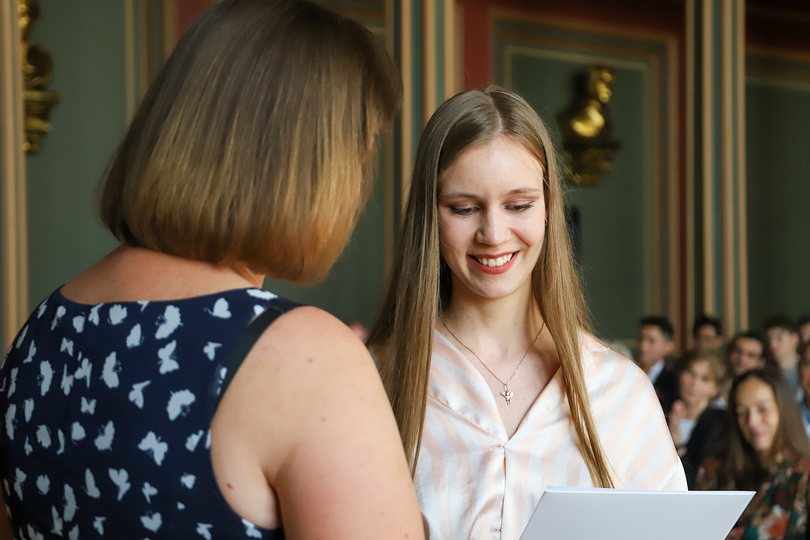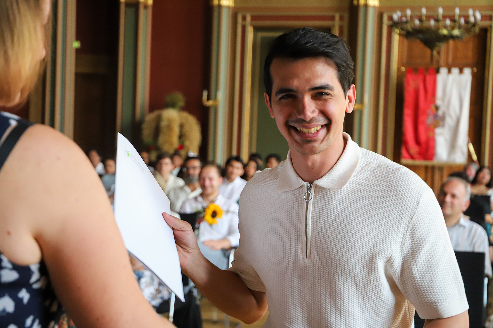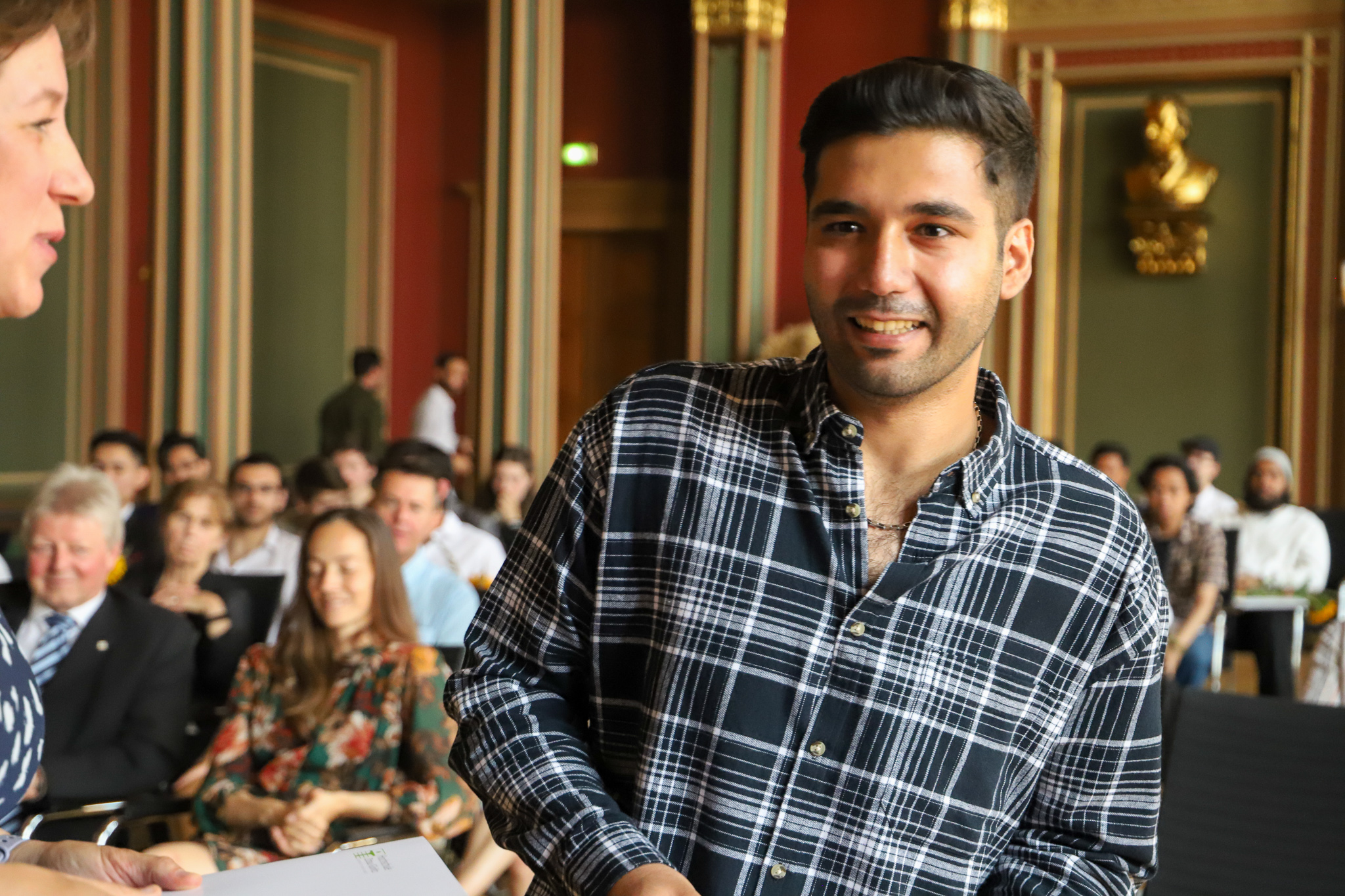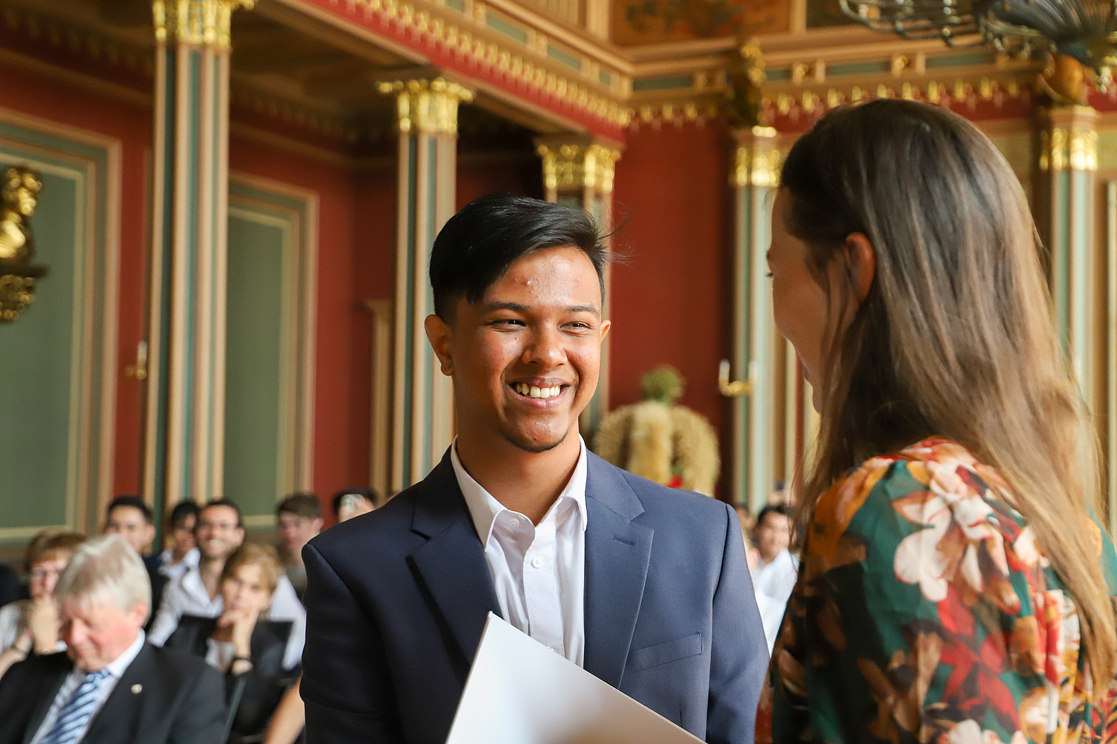 Im Bürgersaal des Zittauer Rathauses herrscht eine ausgelassene, freudige Stimmung. 46 junge Menschen aus 16 verschiedenen Ländern haben sich schick gemacht und sind voller Stolz auf einen besonderen Moment gespannt: die Zeugnisausgabe des Studienkollegs der Hochschule Zittau/Görlitz. Obwohl der Bürgersaal bereits Schauplatz vieler feierlicher Veranstaltungen war, liegt heute etwas ganz Besonderes in der Luft. Die emotionale Atmosphäre spiegelt die Vielfalt der Kulturen der Kollegiat*innen wider. Diese gelebte Internationalität in unserer Dreiländerregion geht unter die Haut und berührt das Herz. Schnell wird klar: Die Vorbereitung dieser hochmotivierten jungen Menschen aus aller Welt auf ein Studium in Deutschland kann eine Antwort auf den Fachkräftemangel sein! Einige der Kollegiat*innen haben eine Flüchtlingsbiographie. Mit dem Studienkolleg bietet die Hochschule Zittau/Görlitz Menschen, die ihre Heimatregion verlassen müssen, eine echte Zukunftsperspektive.