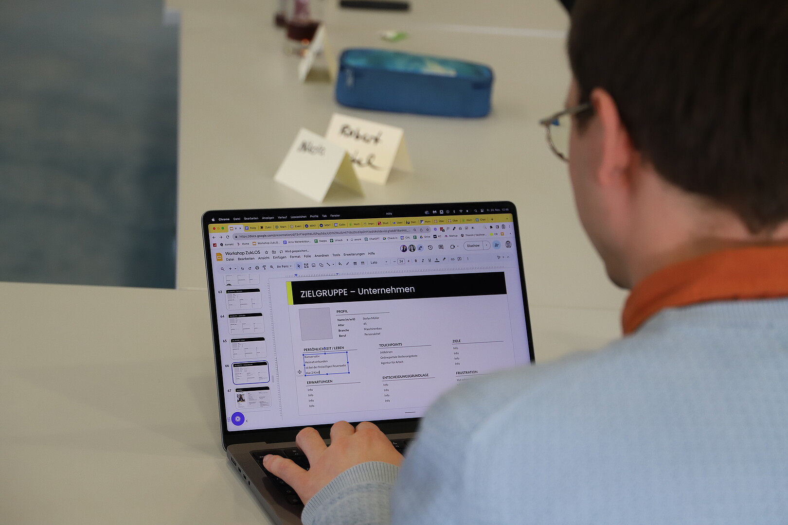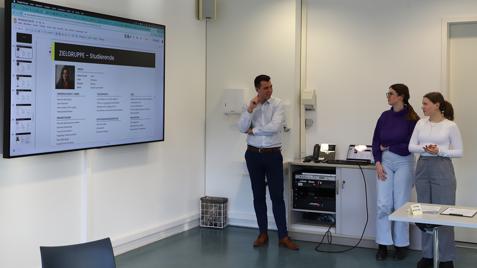 Am zweiten Tag des Workshops haben die Studierenden des Bachelorstudiengangs „Internationale Wirtschaftskommunikation (WMb22)“ einen großen Beitrag zur Markenentwicklung geleistet. Zu Beginn fasste Collective Brain die Ergebnisse des ersten Workshop-Tages zusammen, um eine solide Grundlage für die Diskussion zu schaffen. Anschließend arbeiteten die Studierenden eng mit Mitarbeitenden von ZukLOS und von Collective Brain zusammen, um in Kleingruppen Personas für die zentralen Zielgruppen von ZukLOS zu erstellen. Dazu gehörten Studierende, Lehrkräfte, Schülerinnen und Schüler, Senior*innen, Eltern und Unternehmen. Basierend auf diesen Personas wurde ein Marketing-Basiskonzept entwickelt, das die Bedürfnisse und Wünsche der verschiedenen Zielgruppen berücksichtigte. Die Kommunikationsziele, insbesondere für den Website-Inhalt, wurden definiert, um sicherzustellen, dass die Botschaften von ZukLOS klar und ansprechend präsentiert werden. Schließlich wurden die zentralen Ergebnisse des Workshops zusammengefasst und ein Ausblick auf mögliche weitere Schritte gegeben.