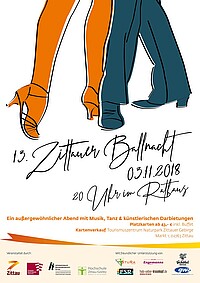 Bereits zum dreizehnten Mal zieht das Zittauer Rathaus am 3. November 2018 Tanzbegeisterte in seinen Bann und verwandelt sich in einen prunkvollen Ballsaal. Ab 20:00 Uhr startet die Big Band „Klangfarben e.V.“ die musikalische Reise durch den Abend, die begleitet wird von Schauspielerinnen und Schauspielern aus dem Ensemble des Gerhart-Hauptmann-Theaters. Für ein abwechslungsreiches Programm sorgen u.a. Studierende des Internationalen Hochschulinstituts Zittau mit verschiedenen Salsa-Tänzen sowie historische Showtanzeinlagen der Tanzgruppe „Villanella“ (CZ). Ausschnitte aus dem berühmten Musical „Cabaret“ - aufgeführt vom Schauspielensemble des Gerhart-Hauptmann-Theaters - runden das Programm ab.