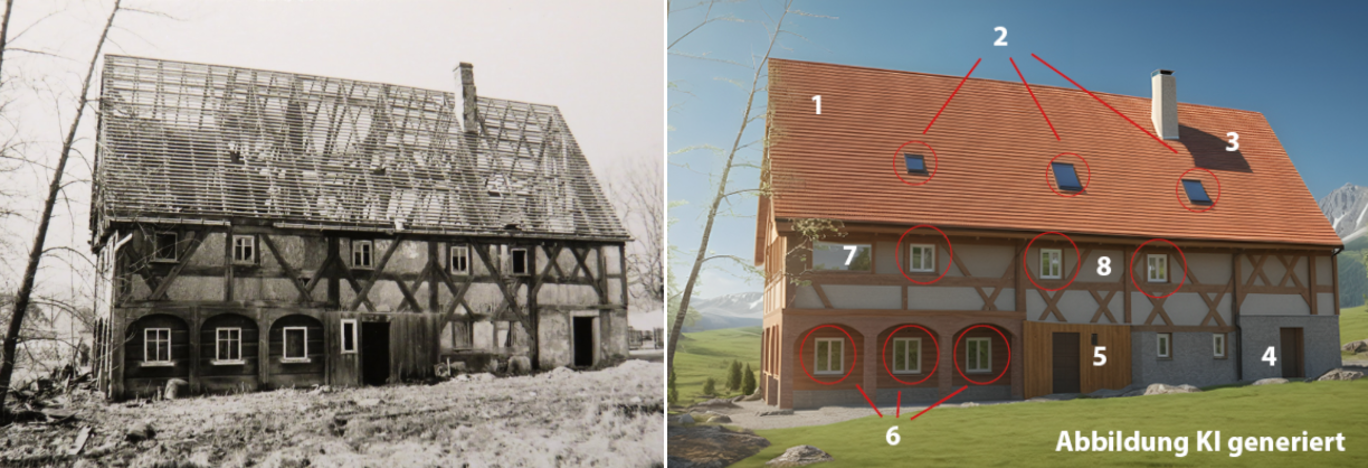 Quelle: Archiv (links), Generator: PromeAI (rechts) Links: Historisches Foto “Hugenottenhaus” Ebersbach-Neugersdorf | Rechts: KI generierte Visualisierung.
