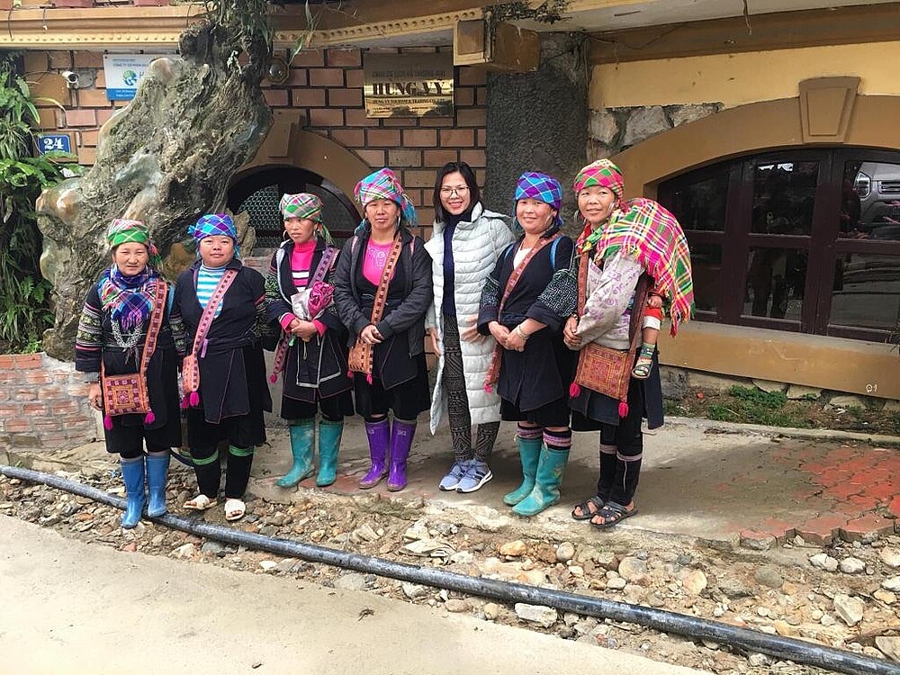 Neben der Landwirtschaft und dem Verkauf von selbst hergestellten Produkten ist der Tourismus eine wichtige Einnahmequelle in der Provinz Lao Cai. Wir besichtigten sehr einfach ausgestattete Häuser der Einheimischen sowie einige lokale Homestays. Im ersten Homestay erholten wir uns etwas von dem steilen Anstieg. Die H’Mong-Frauen nahmen ihre Körbe ab und zum Vorschein kamen selbst hergestellte Produkte. Diese priesen sie wie wild an und uns allen wurde nun einiges klar. Es stellte sich heraus, dass der Smalltalk am Hotel und die Wanderbegleitung quasi Werbung in eigener Sache waren. Eine Vielzahl an verschiedenen selbstgenähten Taschen, Tischdecken oder Kissenbezügen mit gestickten Mustern oder Indigodruck standen zum Verkauf. Natürlich konnten wir nicht wiederstehen und haben alle ordentlich zugeschlagen. Das Wissen, dass der Erlös aus dem Verkauf in den Dörfern der H‘Mong bleibt, war gleich noch ein weiterer Grund ein Souvenir mehr zu kaufen.Als wir am Ziel, dem Dorf Ta Phin, ankamen, erwartete uns ein typisch vietnamesisches Mittagessen. In der oberen Etage besichtigten wir nach dem sehr leckeren Essen ein weiteres Homestay. Dieses war sehr spartanisch eingerichtet. Unten wurde in der Zwischenzeit der Raum umgebaut. Wo wir vor wenigen Augenblicken noch gegessen hatten, standen jetzt Stuhlreihen und Eimer. Diese waren mit heißem Wasser und Kräutern gefüllt. Wir steckten unsere nackten Füße rein und genossen die Wohltat. Unsere Dozenten, die von dem Kräuterbad aus dem letzten Jahr zuvor schwärmten, hatten nicht zu viel versprochen.Letzter Austausch, reisekranke Vietnamesen und ein vergessener Koffer